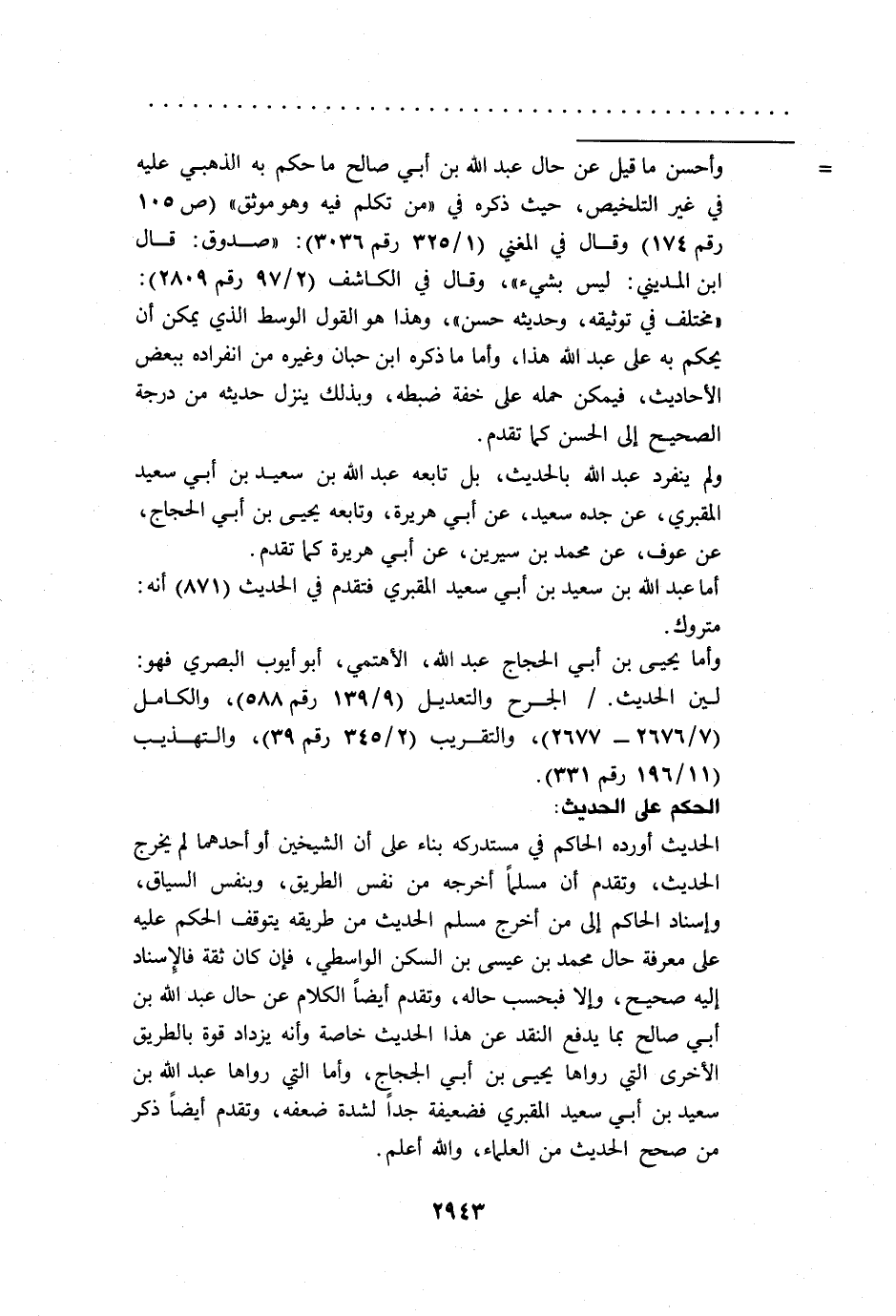 = وأحسن ما قيل عن حال عبد الله بن أبي صالح ما حكم به الذهبي عليه في غير التلخيص، حيث ذكره في "من تكلم فيه وهو موثق" (ص 105 رقم 174) وقال في المغني (1/ 325 رقم 3036): "صدوق: قال ابن المديني: ليس بشيء"، وقال في الكاشف (2/ 97 رقم 2809): "مختلف في توثيقه، وحديثه حسن"، وهذا هو القول الوسط الذي يمكن أن يحكم به على عبد الله هذا، وأما ما ذكره ابن حبان وغيره من انفراده ببعض الأحاديث، فيمكن حمله على خفة ضبطه، وبذلك ينزل حديثه من درجة الصحيح إلى الحسن كما تقدم.