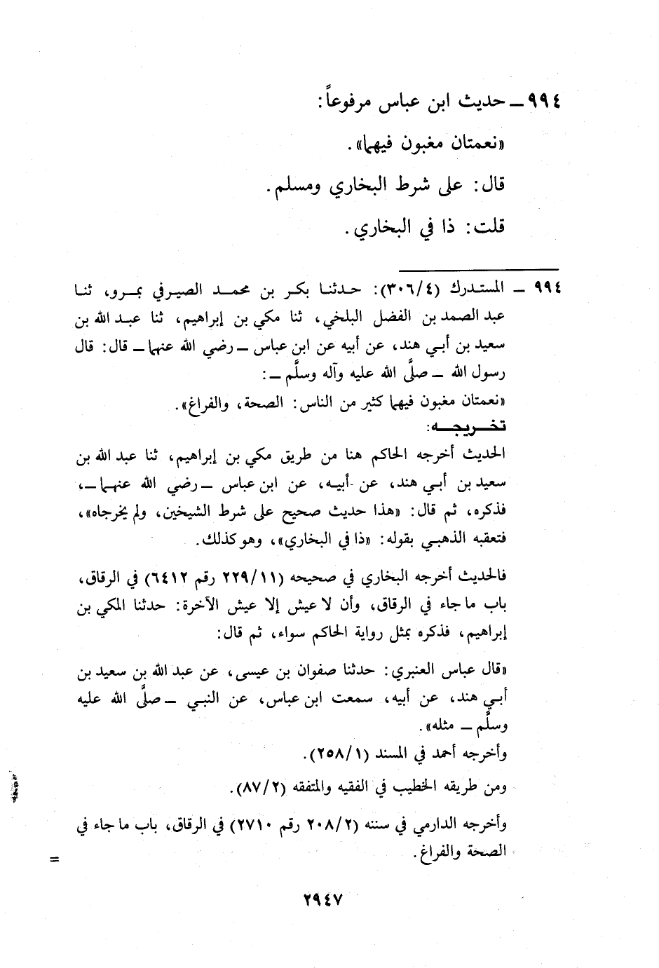 وأخرجه الدارمي في سننه (2/ 208رقم2710) في الرقاق، باب ما جاء في الصحة والفراغ. =