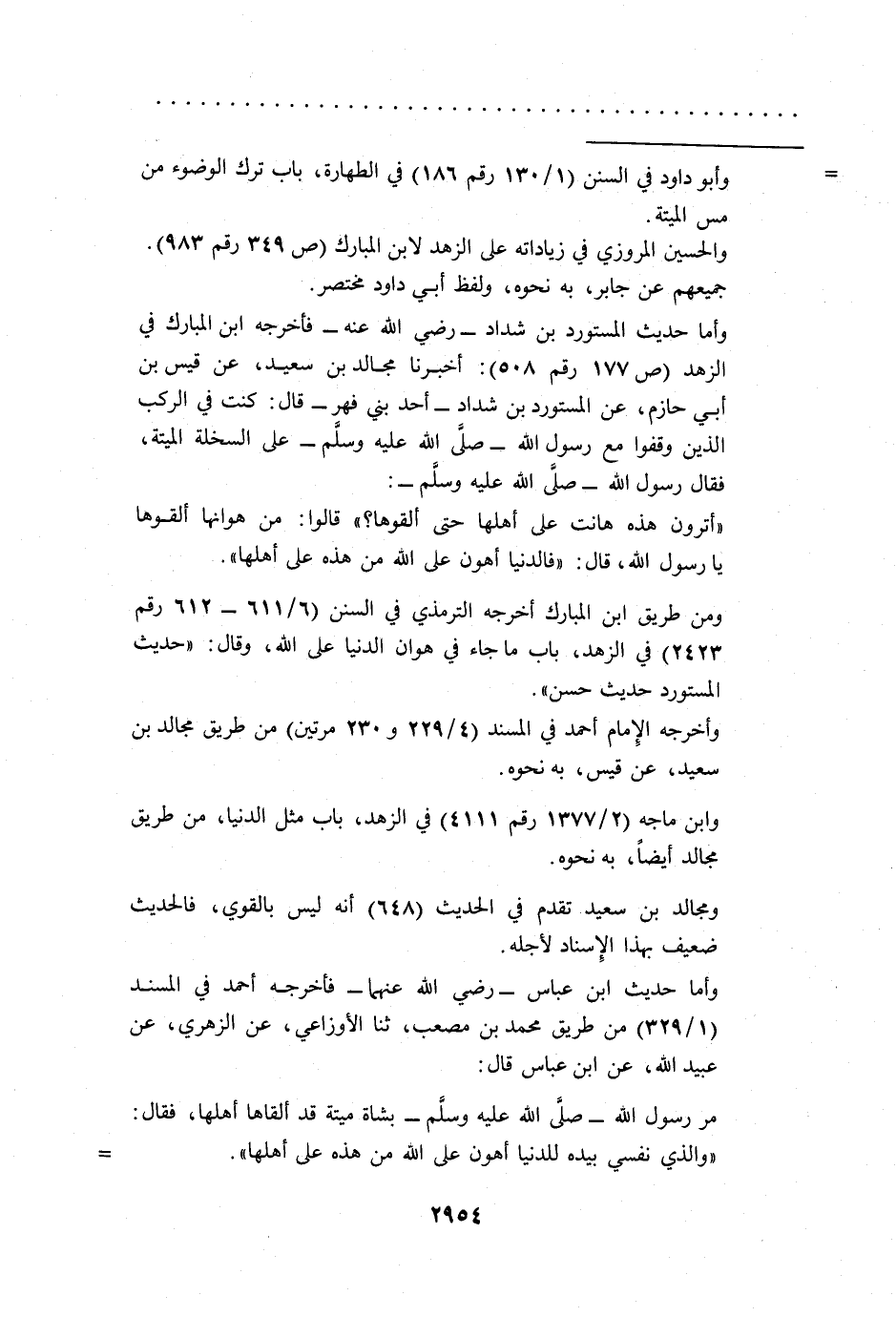 ومن طريق ابن المبارك أخرجه الترمذي في السنن (6/ 611 - 612 رقم 2423) في الزهد، باب ما جاء في هوان الدنيا على الله، وقال: "حديث المستورد حديث حسن".