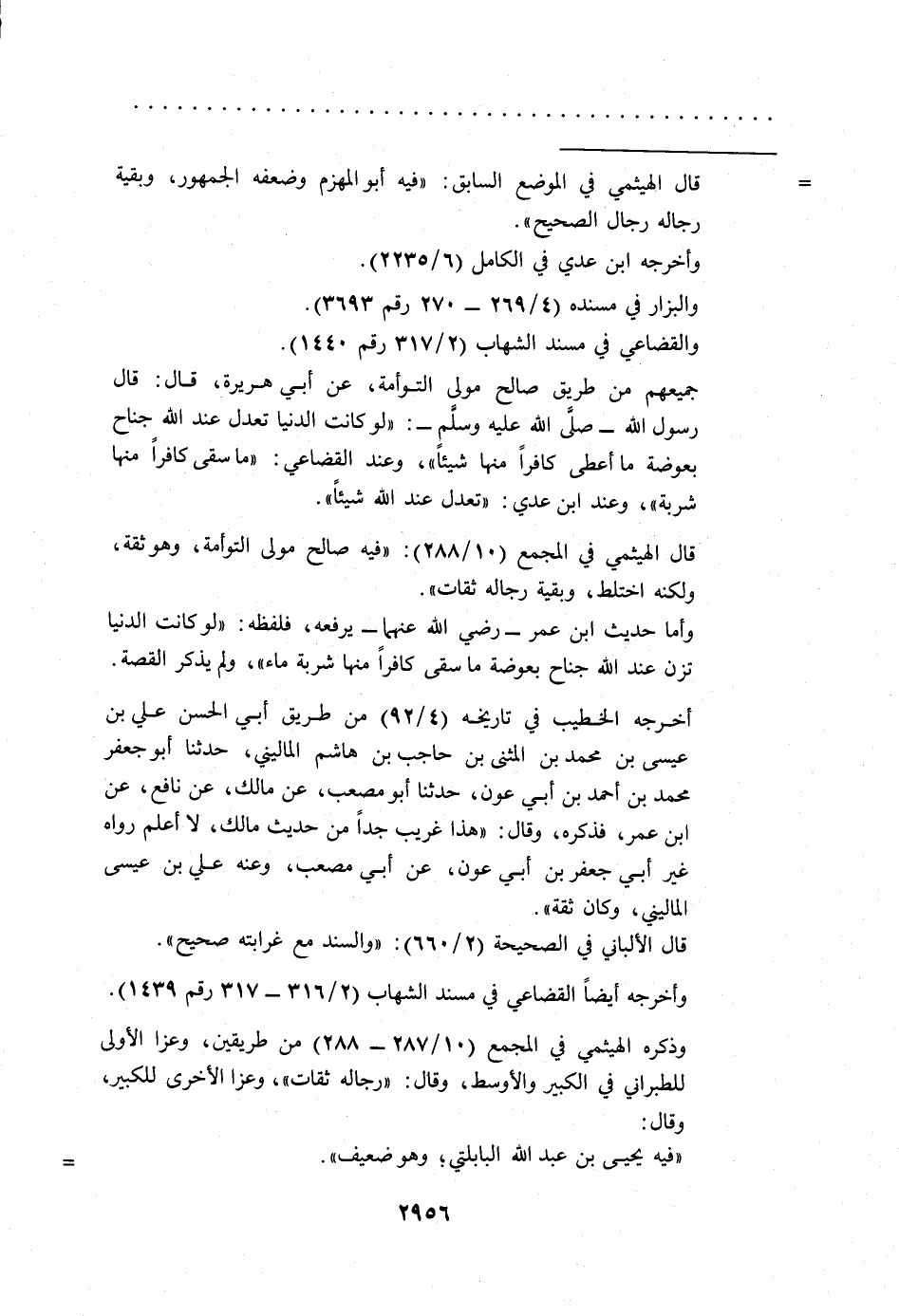 جميعهم من طريق صالح مولى التوأمة، عن أبي هريرة، قال: قال رسول الله -صلَّى الله عليه وسلم-: "لو كانت الدنيا تعدل عند الله جناح بعوضة ما أعطى كافراً منها شيئاً"، وعند القضاعي: "ما سقى كافراً منها شربة"، وعند ابن عدي: "تعدل عند الله شيئاً".