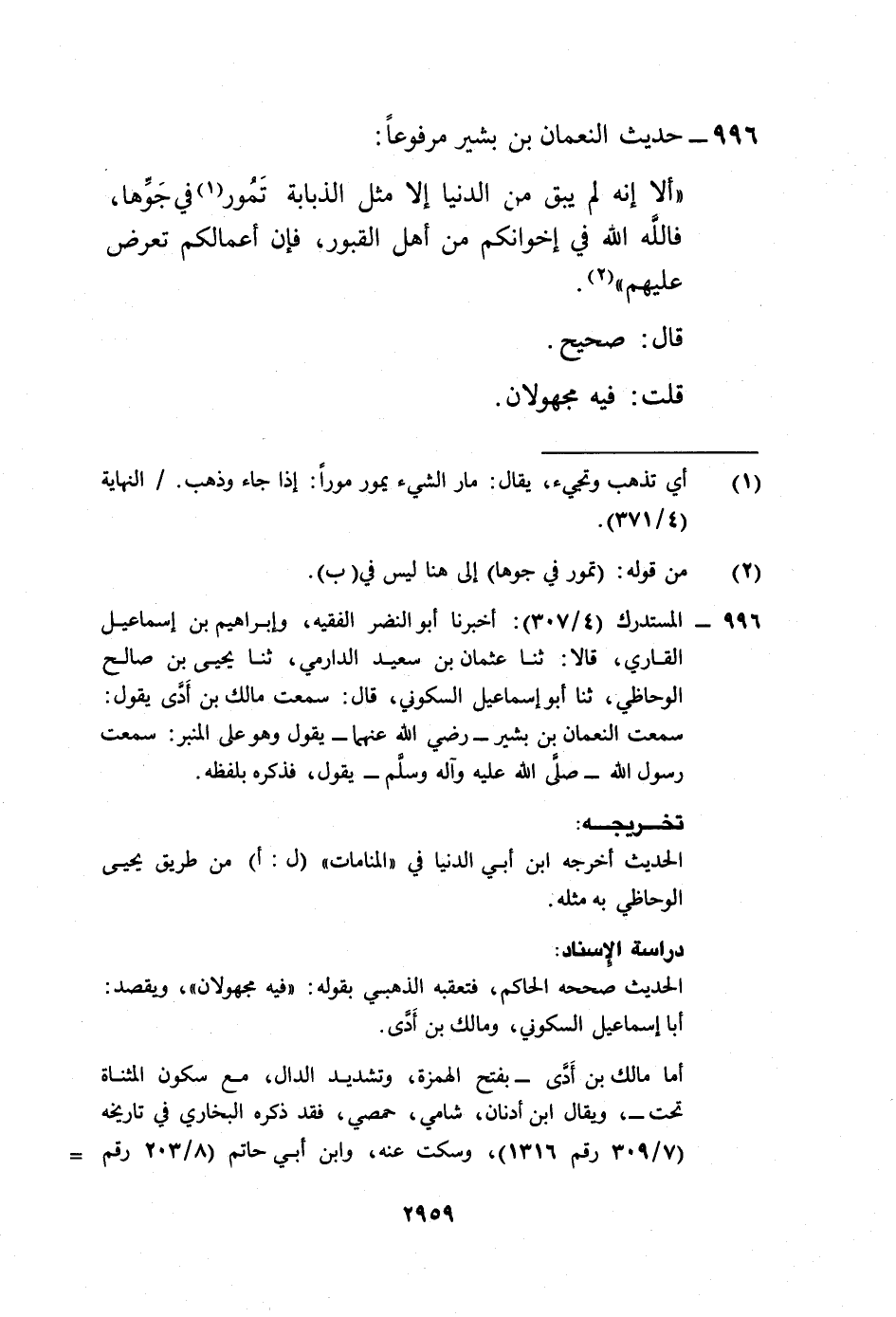 996 - المستدرك (4/ 307): أخبرنا أبو النضر الفقيه، وإبراهيم بن إسماعيل القاري، قالا: ثنا عثمان بن سعيد الدارمي، ثنا يحيى بن صالح الوحاظي، ثنا أبو إسماعيل السكوني، قال: سمعت مالك بن أَدَّى يقول: سمعت النعمان بن بشير -رضي الله عنهما- يقول وهو على المنبر: سمعت رسول الله -صلى الله عليه وآله وسلم- يقول، فذكره بلفظه.