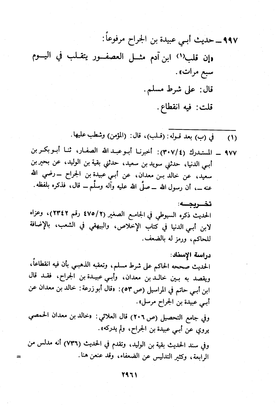 977 - المستدرك (4/ 307): أخبرنا أبو عبد الله الصفار، ثنا أبو بكر بن أبي الدنيا، حدثني سويد بن سعيد، حدثني بقية بن الوليد، عن بحير بن سعيد، عن خالد بن معدان، عن أبي عبيدة بن الجراح -رضي الله عنه-، أن رسول الله -صلى الله عليه وآله وسلم- قال، فذكره بلفظه.