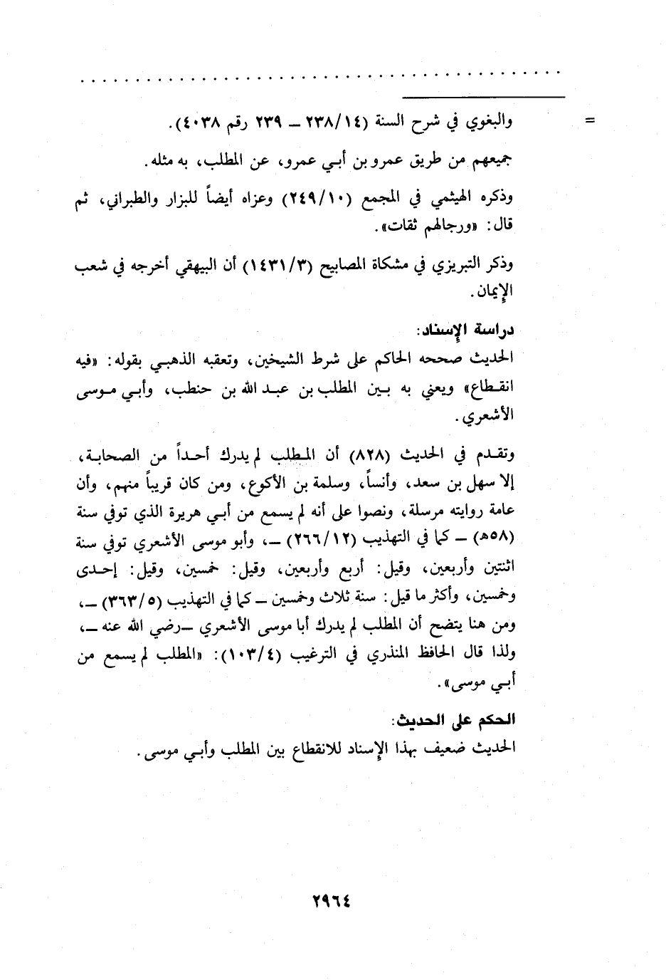 وتقدم في الحديث (828) أن المطلب لم يدرك أحداً من الصحابة، إلا سهل بن سعد، وأنساً، وسلمة بن الأكوع، ومن كان قريباً منهم، وأن عامة روايته مرسلة، ونصوا على أنه لم يسمع من أبي هريرة الذي توفي سنة (58 هـ) -كما في التهذيب (12/ 266) -، وأبو موسى الأشعري توفي سنة اثنتين وأربعين، وقيل: أربع وأربعين، وقيل: خمسين، وقيل: إحدى وخمسين، وأكثر ما قيل: سنة ثلاث وخمسين -كما في التهذيب (5/ 363) -، ومن هنا يتضح أن المطلب لم يدرك أبا موسى الأشعري -رضي الله عنه-، ولذا قال الحافظ المنذري في الترغيب (4/ 103): "المطلب لم يسمع من أبي موسى".