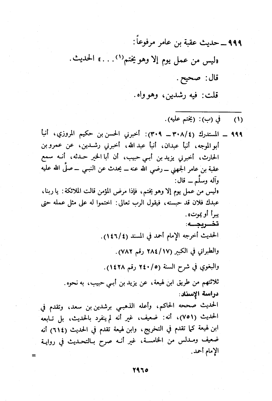 999 - المستدرك (4/ 308 - 309): أخبرني الحسن بن حكيم المروزي، أنبأ أبو الموجه، أنبأ عبدان، أنبأ عبد الله، أخبرني رشدين، عن عمرو بن الحارث، أخبرني يزيد بن أبي حبيب، أن أبا الخير حدثه، أنه سمع عقبة بن عامر الجهني -رضي الله عنه- يحدث عن النبي -صلى الله عليه وآله وسلم- قال: