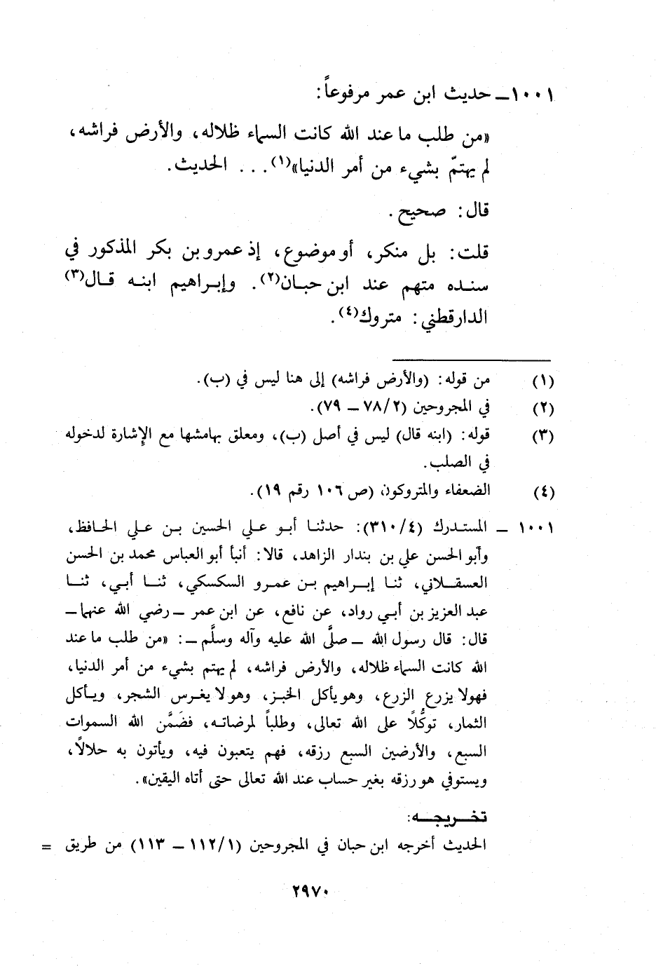 1001 - المستدرك (4/ 310): حدثنا أبو علي الحسين بن علي الحافظ، وأبو الحسن علي بن بندار الزاهد، قالا: أنبأ أبو العباس محمد بن الحسن العسقلاني، ثنا إبراهيم بن عمرو السكسكي، ثنا أبي، ثنا عبد العزيز بن أبي رواد، عن نافع، عن ابن عمر -رضي الله عنهما- قال: قال رسول الله -صلى الله عليه وآله وسلم-: "من طلب ما عند الله كانت السماء ظلاله، والأرض فراشه، لم يهتم بشيء من أمر الدنيا، فهو لا يزرع الزرع، وهو يأكل الخبز، وهو لا يغرس الشجر، ويأكل الثمار، توكُّلًا على الله تعالى، وطلباً لمرضاته، فضَمَّن الله السموات السبع، والأرضين السبع رزقه، فهم يتعبون فيه، ويأتون به حلالاً، ويستوفي هو رزقه بغير حساب عند الله تعالى حتى أتاه اليقين".