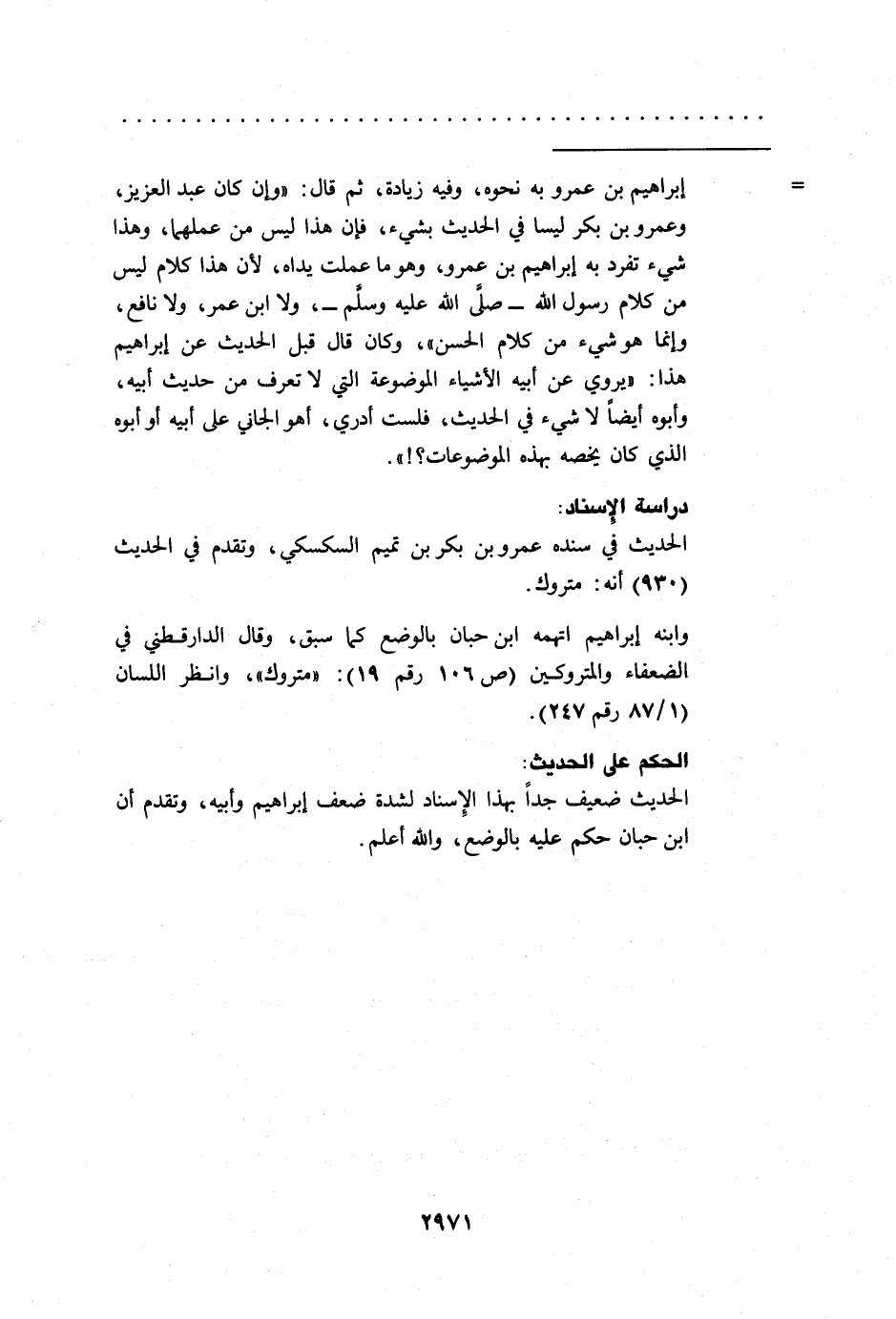 = إبراهيم بن عمرو به نحوه، وفيه زيادة، ثم قال: "وإن كان عبد العزيز، وعمرو بن بكر ليسا في الحديث بشيء، فإن هذا ليس من عملهما، وهذا شيء تفرد به إبراهيم بن عمرو، وهو ما عملت يداه، لأن هذا كلام ليس من كلام رسول الله -صلى الله عليه وسلم-، ولا ابن عمر، ولا نافع، وإنما هو شيء من كلام الحسن"، وكان قال قبل الحديث عن إبراهيم هذا: "يروي عن أبيه الأشياء الموضوعة التي لا تعرف من حديث أبيه، وأبوه أيضاً لا شيء في الحديث، فلست أدري، أهو الجاني على أبيه أو أبوه الذي كان يخصه بهذه الموضوعات؟! ".