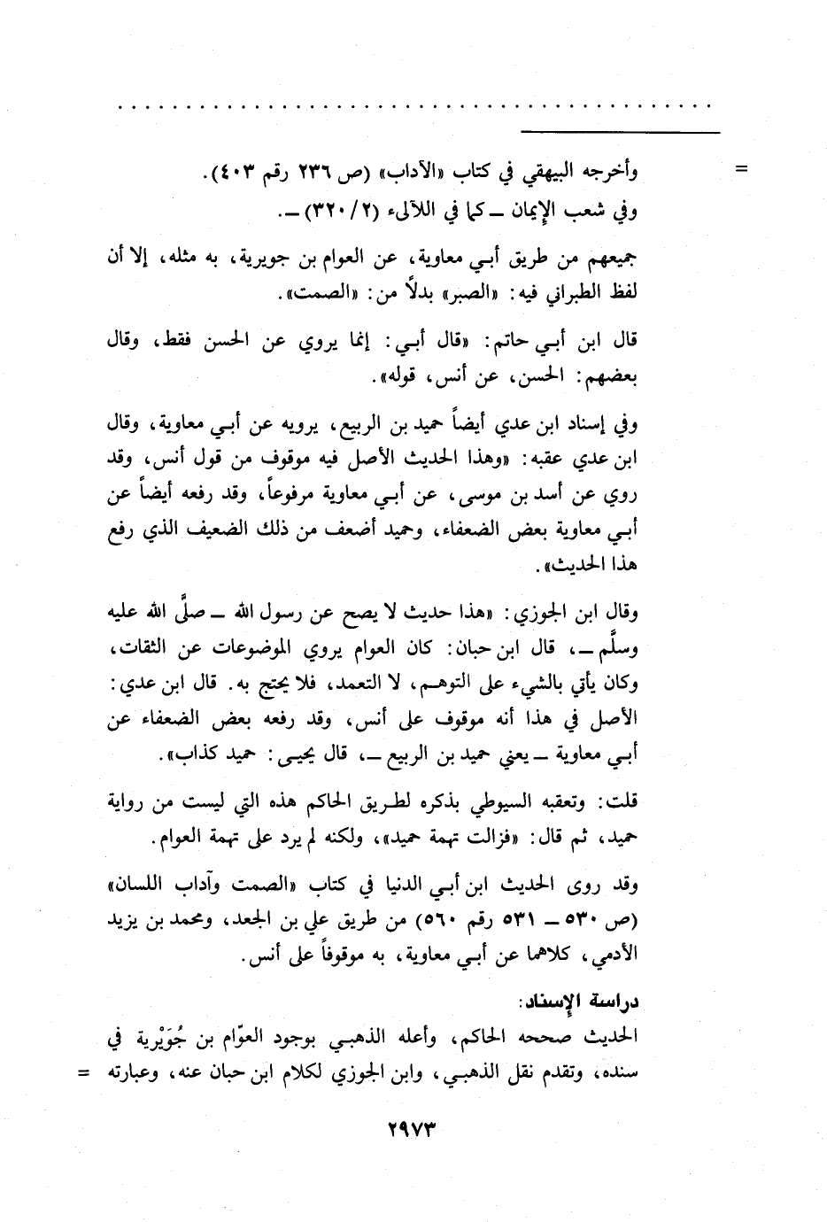 وقد روى الحديث ابن أبي الدنيا في كتاب "الصمت وآداب اللسان" (ص 530 - 531 رقم 560) من طريق علي بن الجعد، ومحمد بن يزيد الآدمي، كلاهما عن أبي معاوية، به موقوفاً على أنس.