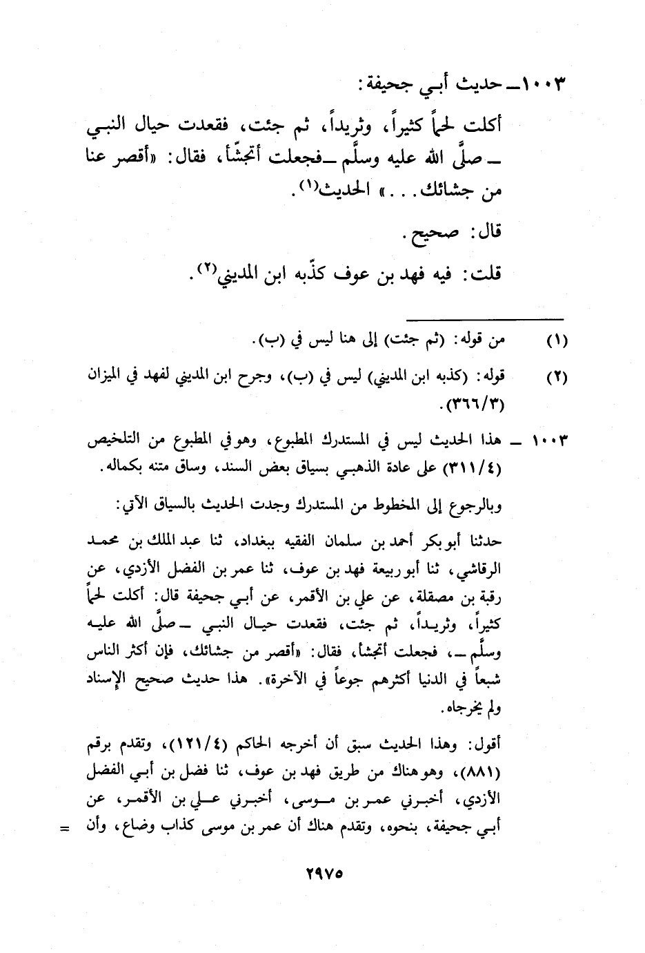 حدثنا أبو بكر أحمد بن سلمان الفقيه ببغداد، ثنا عبد الملك بن محمد الرقاشي، ثنا أبو ربيعة فهد بن عوف، ثنا عمر بن الفضل الأزدي، عن رقبة بن مصقلة، عن علي بن الأقمر، عن أبي جحيفة قال: أكلت لحماً كثيراً، وثريداً، ثم جئت، فقعدت حيال النبي -صلى الله عليه وسلم-، فجعلت أتجشأ، فقال: "أقصر من جشائك، فإن أكثر الناس شبعاً في الدنيا أكثرهم جوعاً في الآخرة". هذا حديث صحيح الإِسناد ولم يخرجاه.