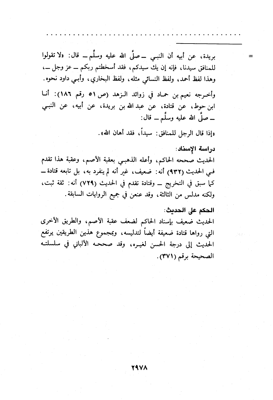 = بريدة، عن أبيه أن النبي -صلى الله عليه وسلم- قال: "لا تقولوا للمنافق سيدنا، فإنه إن يك سيدكم، فقد أسخطتم ربكم -عز وجل-، وهذا لفظ أحمد، ولفظ النسائي مثله، ولفظ البخاري، وأبي داود نحوه.