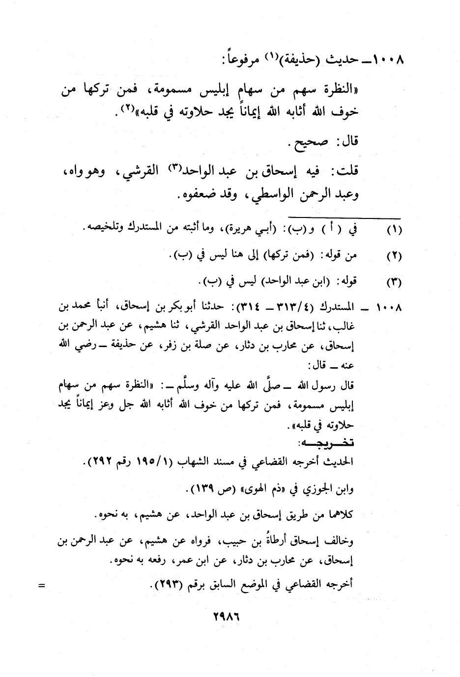 1008 - المستدرك (4/ 313 - 314): حدثنا أبو بكر بن إسحاق، أنبأ محمد بن غالب، ثنا إسحاق بن عبد الواحد القرشي، ثنا هشيم، عن عبد الرحمن بن إسحاق، عن محارب بن دثار، عن صلة بن زفر، عن حذيفة -رضي الله عنه- قال: