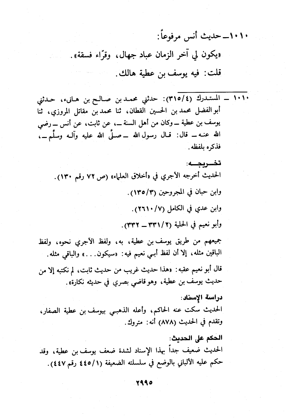 1010 - المستدرك (4/ 315): حدثني محمد بن صالح بن هانئ، حدثني أبو الفضل محمد بن الحسين القطان، ثنا محمد بن مقاتل المروزي، ثنا يوسف بن عطية -وكان من أهل السنة- عن ثابت، عن أنس -رضي الله عنه- قال: قال رسول الله -صلى الله عليه وآله وسلم-، فذكره بلفظه.