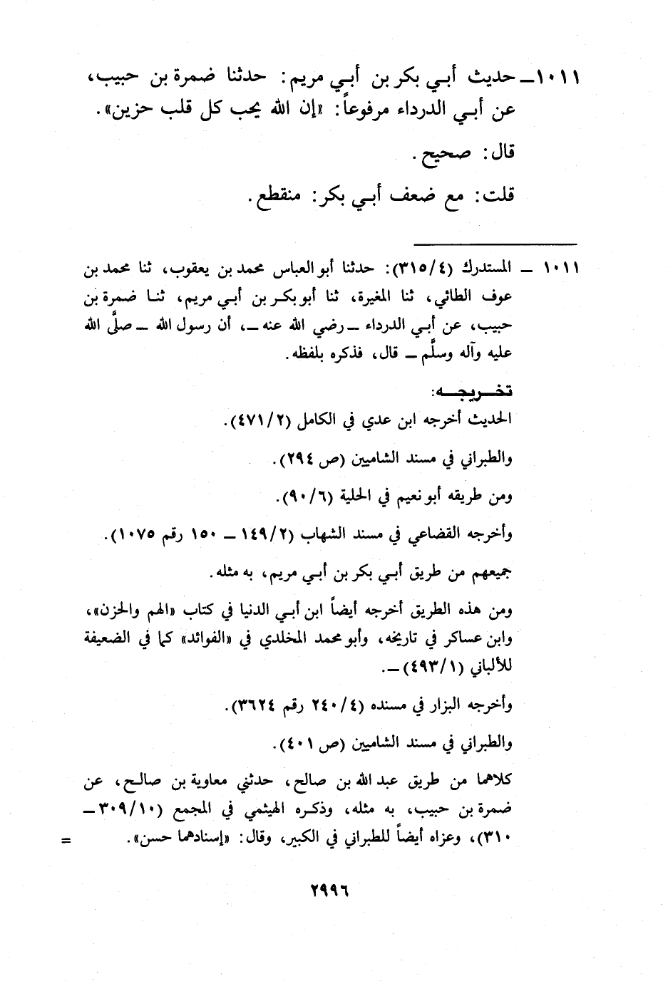 1011 - المستدرك (4/ 315): حدثنا أبو العباس محمد بن يعقوب، ثنا محمد بن عوف الطائي، ثنا المغيرة، ثنا أبو بكر بن أبي مريم، ثنا ضمرة بن حبيب، عن أبي الدرداء -رضي الله عنه-، أن رسول الله -صلى الله عليه وآله وسلم- قال، فذكره بلفظه.