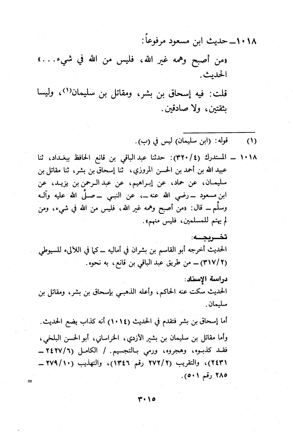 1018 - المستدرك (4/ 320): حدثنا عبد الباقي بن قانع الحافظ ببغداد، ثنا عبيد الله بن أحمد بن الحسن المروزي، ثنا إسحاق بن بشر، ثنا مقاتل بن سليمان، عن حماد، عن إبراهيم، عن عبد الرحمن بن يزيد، عن ابن مسعهد -رضي الله عنه -، عن النبي -صلى الله عليه وآله وسلم- قال: "من أصبح وهمه غير الله، فليس من الله في شيء، ومن لم يهتم للمسلمين، فليس منهم".