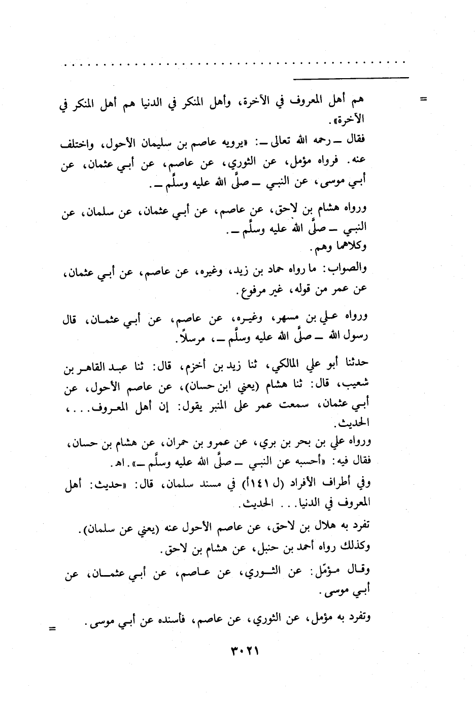 فقال -رحمه الله تعالى-: "يرويه عاصم بن سليمان الأحول، واختلف عنه. فرواه مؤمل، عن الثوري، عن عاصم، عن أبي عثمان، عن أبي موسى، عن النبي -صلى الله عليه وسلم-.