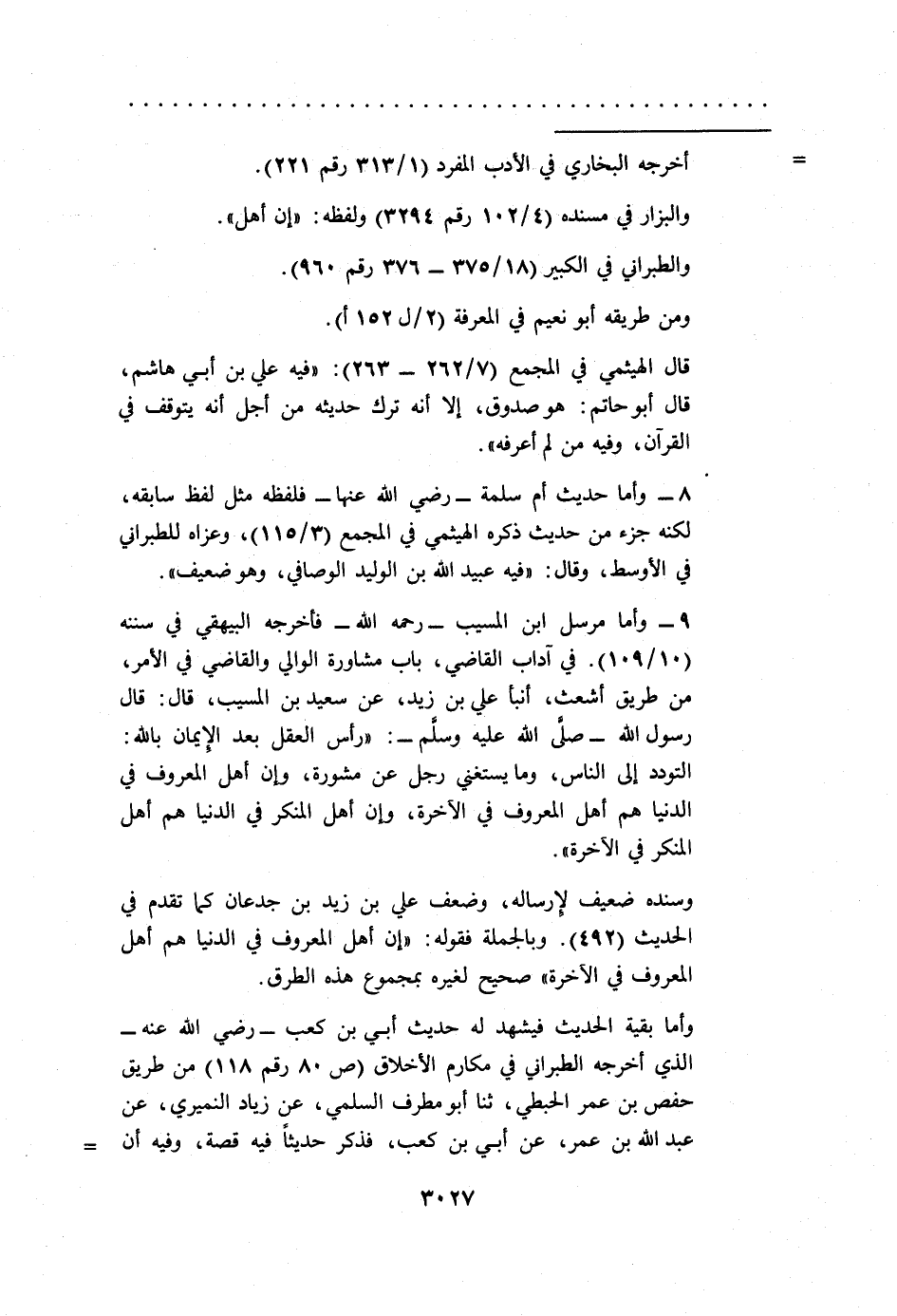 9 - وأما مرسل ابن المسيب -رحمه الله- فأخرجه البيهقي في سننه (10/ 109). في آداب القاضي، باب مشاورة الوالي والقاضي في الأمر، من طريق أشعث، أنبأ علي بن زيد، عن سعيد بن المسيب، قال: قال رسول الله -صلى الله عليه وسلم-: "رأس العقل بعد الإيمان بالله: التودد إلى الناس، وما يستغني رجل عن مشورة، وإن أهل المعروف في الدنيا هم أهل المعروف في الآخرة، وإن أهل المنكر في الدنيا هم أهل المنكر في الآخرة".