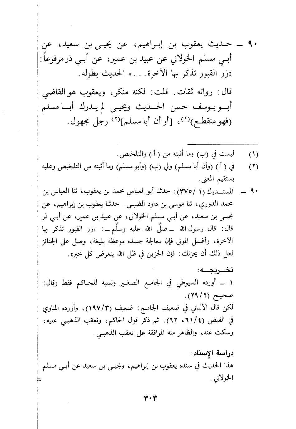 90 - المستدرك (1/ 375): حدثنا أبو العباس محمد بن يعقوب، ثنا العباس بن محمد الدوري، ثنا موسى بن داود الضبي. حدثنا يعقوب بن إبراهيم، عن يحيى بن سعيد، عن أبي مسلم الخولاني، عن عبيد بن عمير، عن أبي ذر قال: قال رسول الله -صلى الله عليه وسلم-: "زر القبور تذكر بها الآخرة، وأغسل الموتى فإن معالجة جسده موعظة بليغة، وصل على الجنائز لعل ذلك أن يحزنك: فإن الحزين في ظل الله يتعرض كل خير".