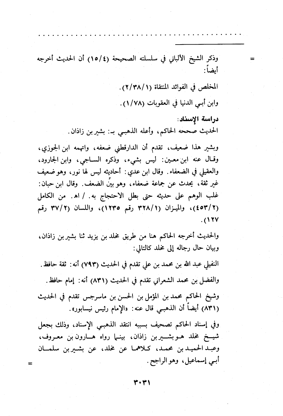 وفي إسناد الحاكم تصحيف بسببه انتقد الذهبي الإسناد، وذلك بجعل شيخ مخلد هو بشير بن زاذان، بينما رواه هارون بن معروف، وعبد الحميد بن محمد، كلاهما عن مخلد، عن بشير بن سلمان أبي إسماعيل، وهو الراجح. =