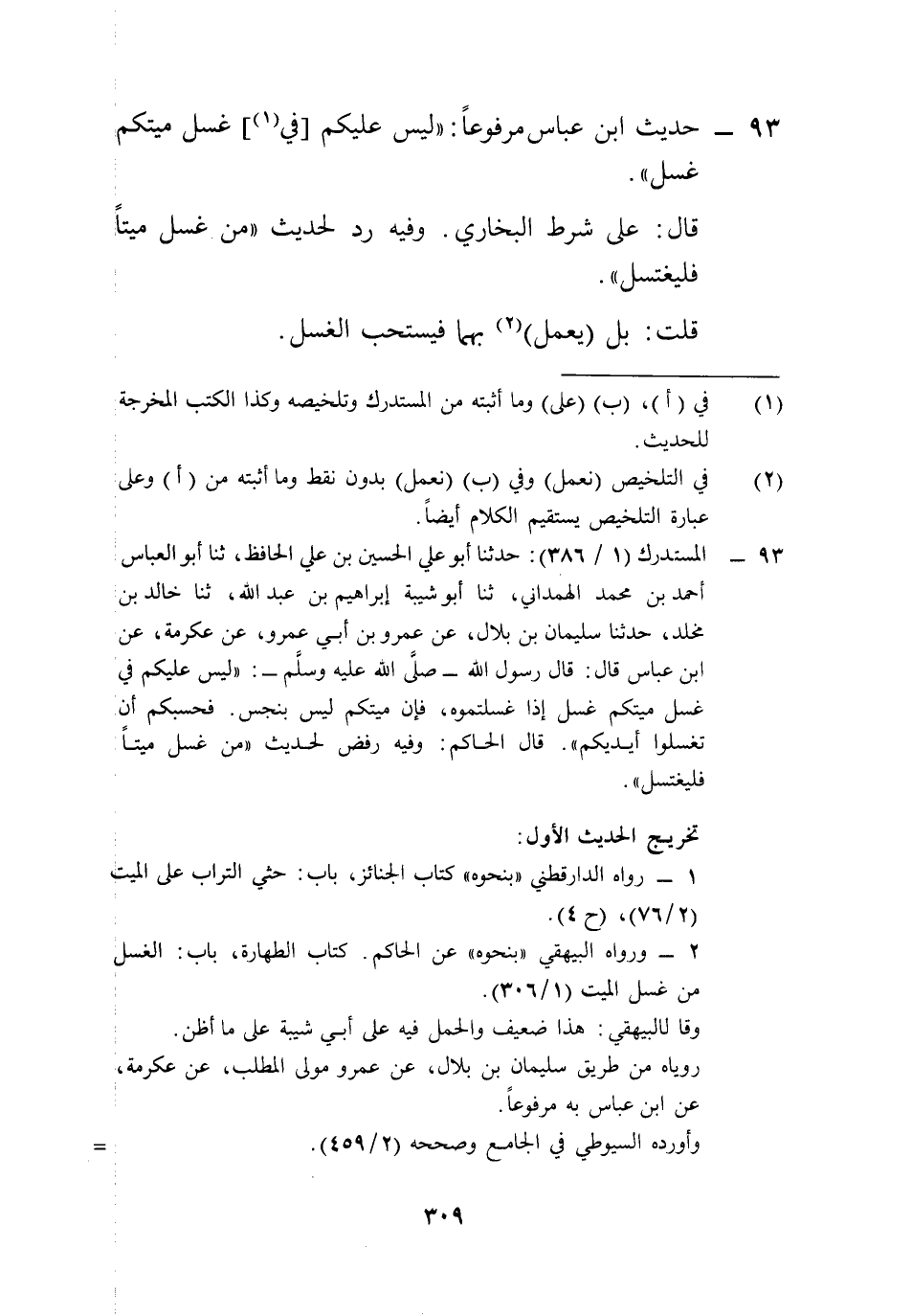 93 - المستدرك (1/ 386): حدثنا أبو علي الحسين بن علي الحافظ، ثنا أبو العباس أحمد بن محمد الهمداني، ثنا أبو شيبة إبراهيم بن عبد الله، ثنا خالد بن مخلد، حدثنا سليمان بن بلال، عن عمرو بن أبي عمرو، عن عكرمة، عن ابن عباس قال: قال رسول الله -صلى الله عليه وسلم-: "ليس عليكم في غسل ميتكم غسل إذا غسلتمو، فإن ميتكم ليس بنجس. فحسبكم أن تغسلوا أيديكم". قال الحاكم: وفيه رفض لحديث "من غسل ميتاً فليغتسل".