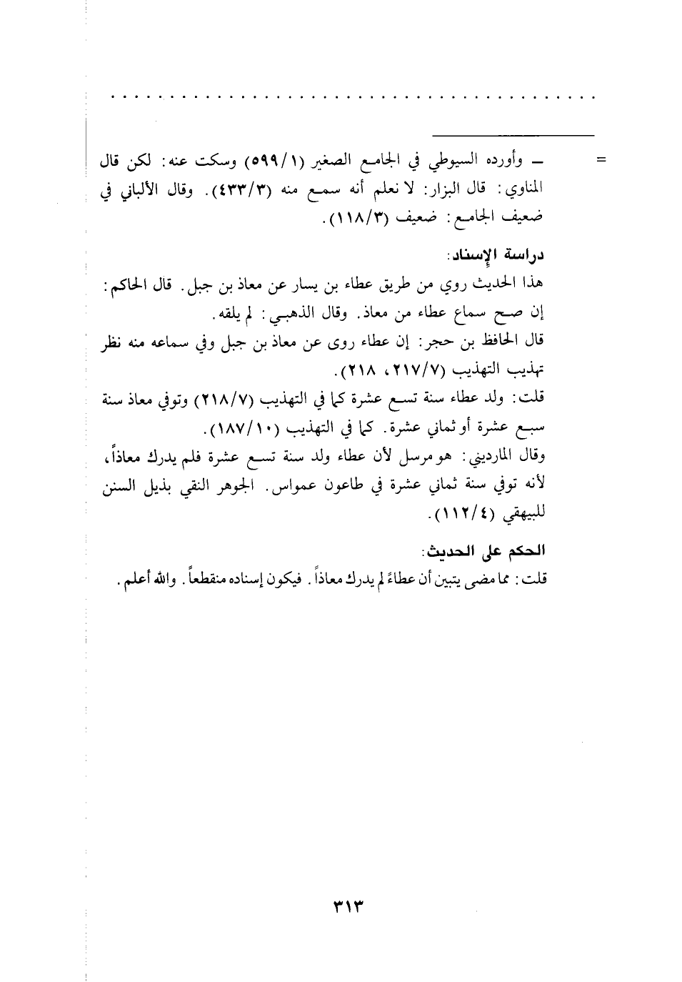قلت: مما مضى يتبين أن عطاءً لم يدرك معاذاً. فيكون إسناده منقطعاً. والله أعلم.