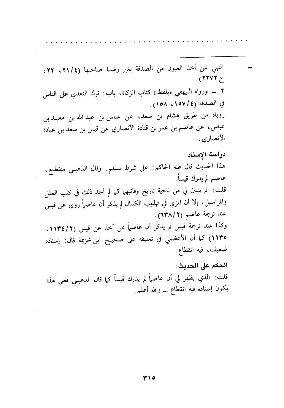قلت: الذي يظهر لي أن عاصماً لم يدرك قيساً كما قال الذهبي فعلى هذا يكون إسناده فيه انقطاع -والله أعلم-.