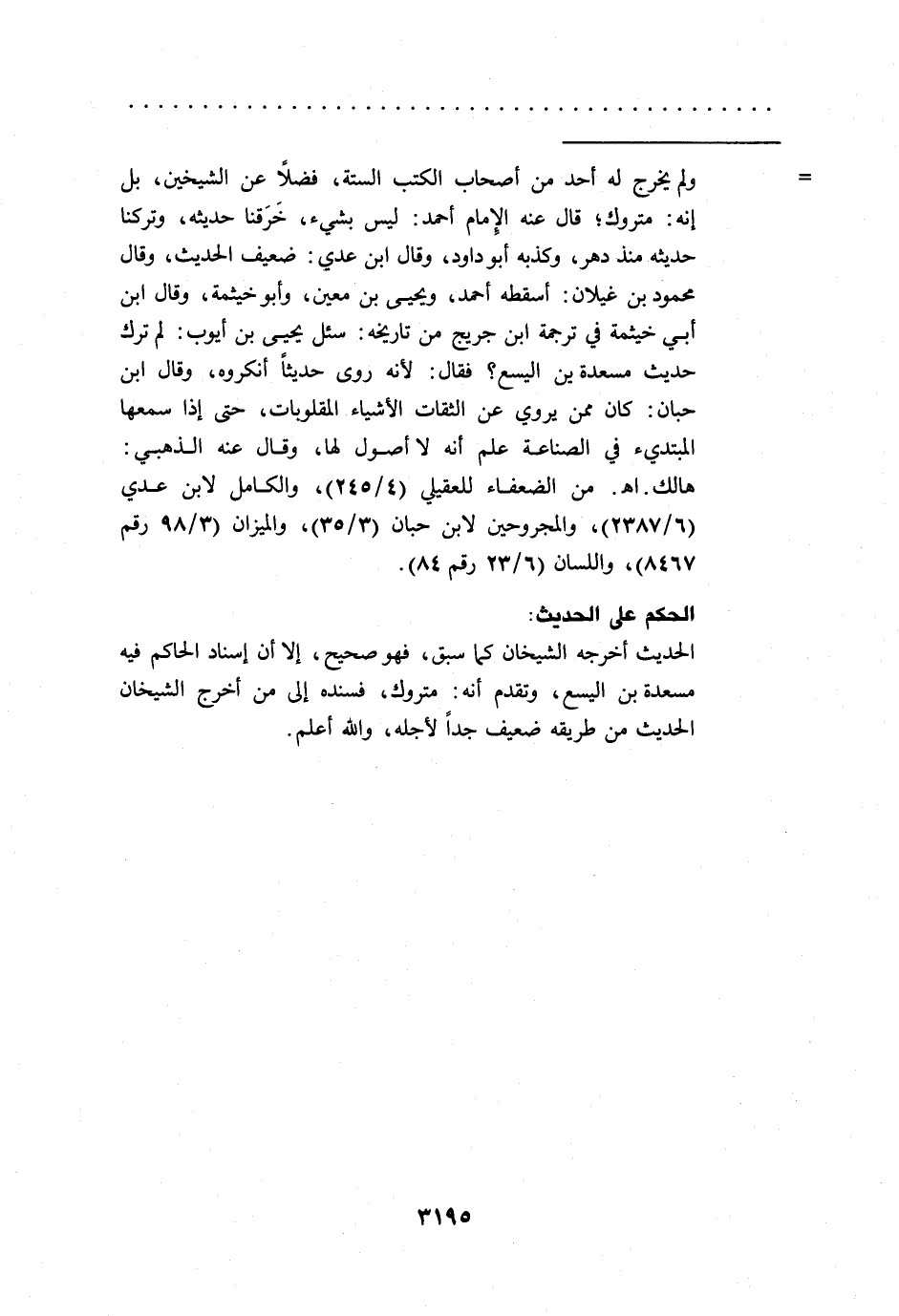 = ولم يخرج له أحد من أصحاب الكتب الستة، فضلاً عن الشيخين، بل إنه: متروك؛ قال عنه الإمام أحمد: ليس بشيء، خَرَقنا حديثه، وتركنا حديثه منذ دهر، وكذبه أبو داود، وقال ابن عدى: ضعيف الحديث، وقال محمود بن غيلان: أسقطه أحمد، ويحيى بن معين، وأبو خيثمة، وقال ابن أبي خيثمة في ترجمة ابن جريج من تاريخه: سئل يحيى بن أيوب: لم ترك حديث مسعدة بن اليسع؟ فقال: لأنه روى حديثاً أنكروه، وقال ابن حبان: كان ممن يروي عن الثقات الأشياء المقلوبات، حتى إذا سمعها المبتديء في الصناعة علم أنه لا أصول لها، وقال عنه الذهبي: هالك. اهـ. من الضعفاء للعقيلي (4/ 245)، والكامل لابن عدي (6/ 2387)، والمجروحين لابن حبان (3/ 35)، والميزان (3/ 98 رقم 8467)، واللسان (6/ 23 رقم 84).