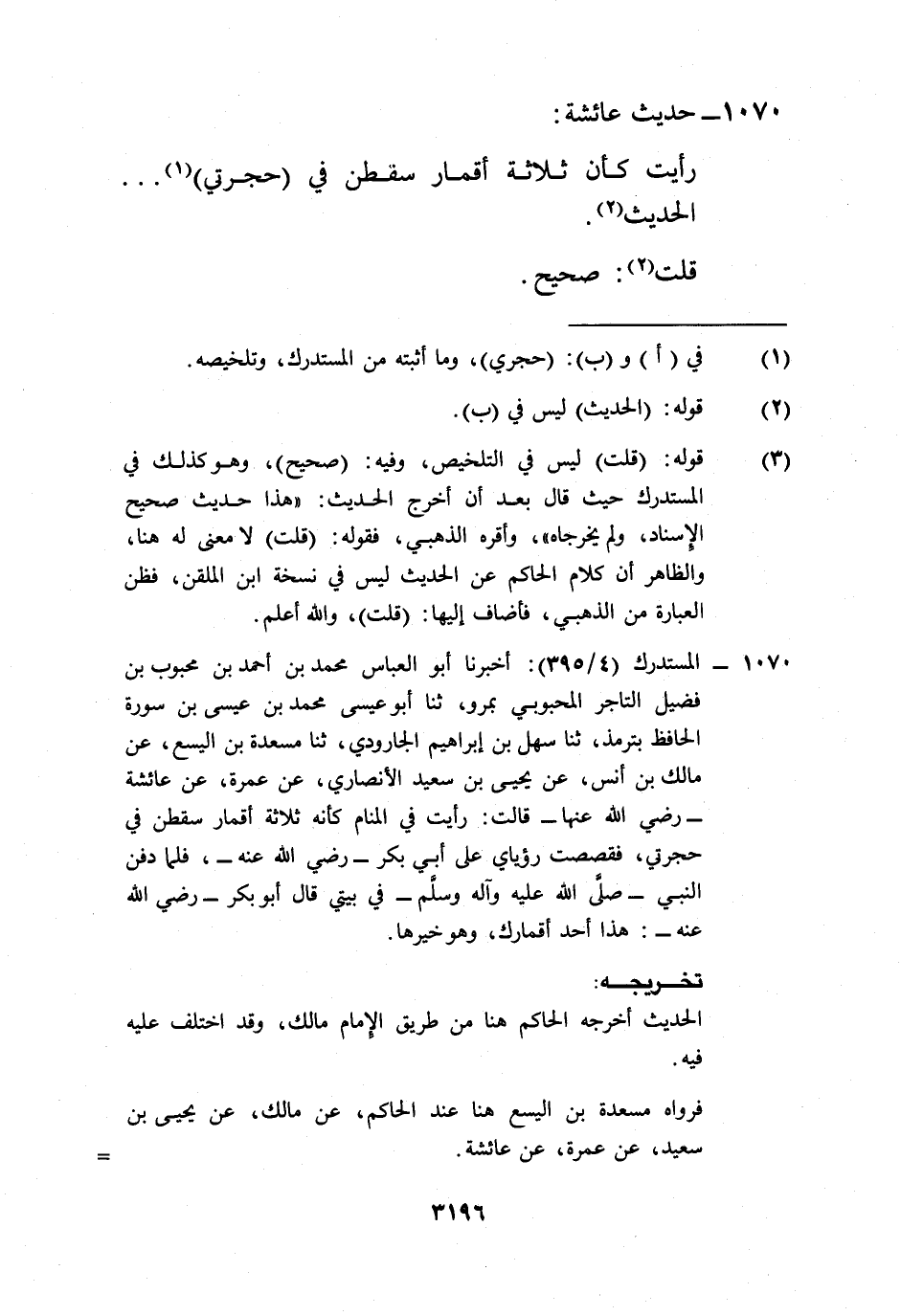 1070 - المستدرك (4/ 395): أخبرنا أبو العباس محمد بن أحمد بن محبوب بن فضيل التاجر المحبوبي بمرو، ثنا أبو عيسى محمد بن عيسى بن سورة الحافظ بترمذ، ثنا سهل بن إبراهيم الجارودي، ثنا مسعدة بن اليسع، عن مالك بن أنس، عن يحيى بن سعيد الأنصاري، عن عمرة، عن عائشة -رضي الله عنها- قالت: رأيت في المنام كأنه ثلاثة أقمار سقطن في حجرتي، فقصصت رؤياي على أبي بكر -رضي الله عنه-، فلما دفن النبي -صلى الله عليه وآله وسلم- في بيتي قال أبو بكر -رضي الله عنه-: هذا أحد أقمارك، وهو خيرها.