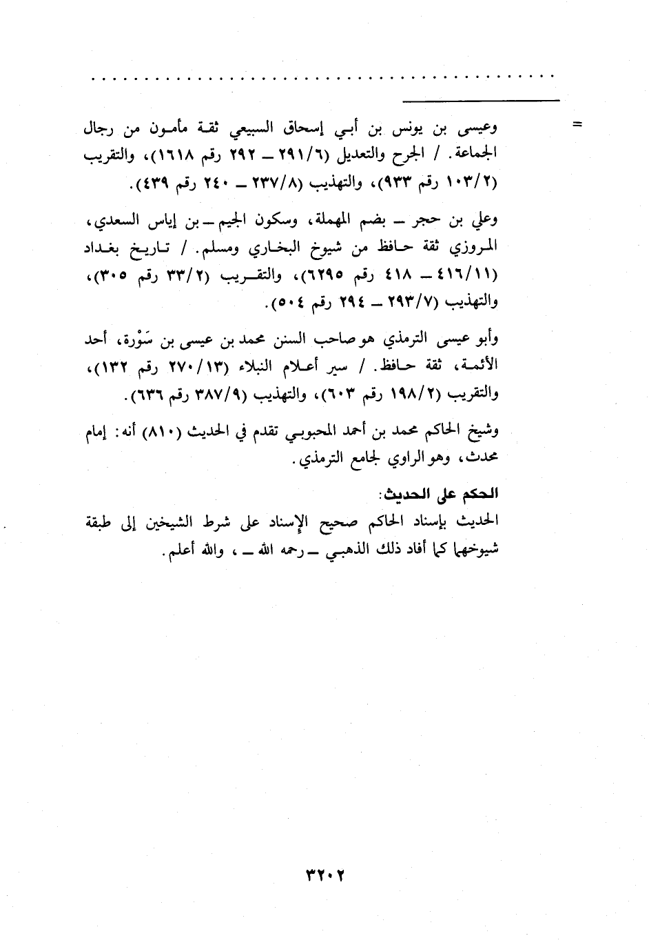 = وعيسى بن يونس بن أبي إسحاق السبيعي ثقة مأمون من رجال الجماعة./ الجرح والتعديل (6/ 291 - 292 رقم 1618)، والتقريب (2/ 103 رقم 933)، والتهذيب (8/ 237 - 240رقم 439).