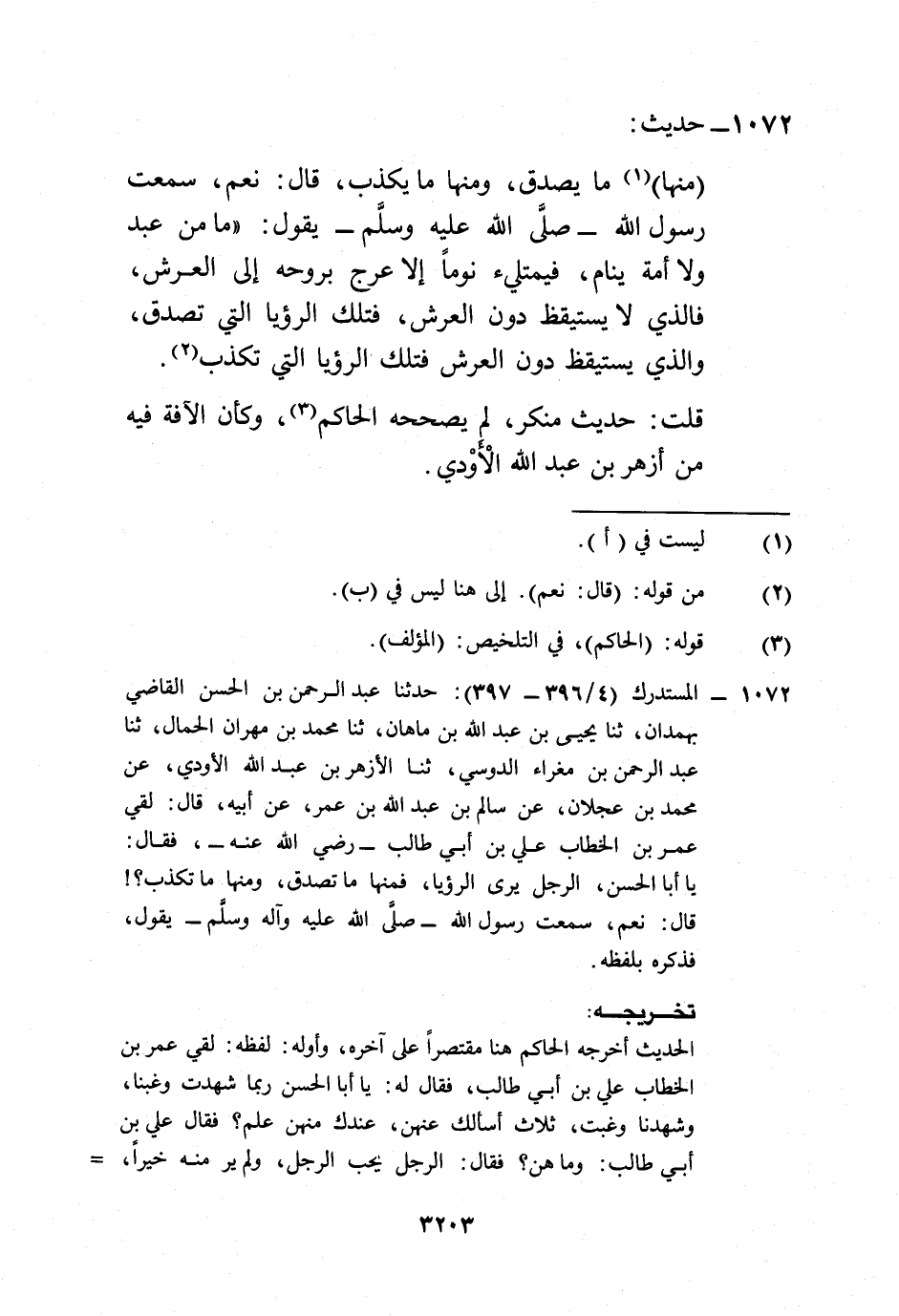 1072 - المستدرك (4/ 396 - 397): حدثنا عبد الرحمن بن الحسن القاضي بهمدان، ثنا يحيى بن عبد الله بن ما هان، ثنا محمد بن مهران الحمال، ثنا عبد الرحمن بن مغراء الدوسي، ثنا الأزهر بن عبد الله الأودي، عن محمد بن عجلان، عن سالم بن عبد الله بن عمر، عن أبيه، قال: لقي عمر بن الخطاب علي بن أبي طالب -رضي الله عنه-، فقال: يا أبا الحسن، الرجل يرى الرؤيا، فمنها ما تصدق، ومنها ما تكذب؟! قال: نعم، سمعت رسول الله- صلى الله عليه وآله وسلم- يقول، فذكره بلفظه.