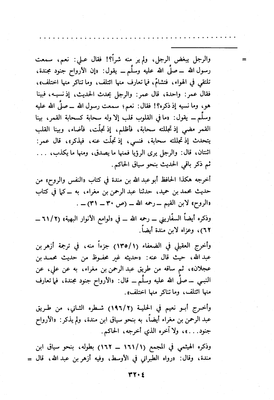 = والرجل يبغض الرجل، ولم ير منه شراً؟! فقال علي: نعم، سمعت رسول الله -صلى الله عليه وسلم- يقول: "إن الأرواح جنود مجندة، تلتقي في الهواء، فتشامّ، فما تعارف منها ائتلف، وما تناكر منها اختلف"، فقال عمر: واحدة، قال عمر: والرجل يحدث الحديث، إذ نسيه، فبينا هو، وما نسيه إذ ذكره؟! فقال: نعم؛ سمعت رسول الله -صلى الله عليه وسلم- يقول: "ما في القلوب قلب إلا وله سحابة كسحابة القمر، بينا القمر مضي إذ تجللته سحابة، فأظلم، إذ تجلّت، فأضاء، وبينا القلب يتحدث إذ تجللته سحابة، فنسي، إذ تجلّت عنه، فيذكر"، قال عمر: اثنتان، قال: والرجل يرى الرؤيا فمنها ما يصدق، ومنها ما يكذب، ... ثم ذكر باقي الحديث بنحو سياق الحاكم.
