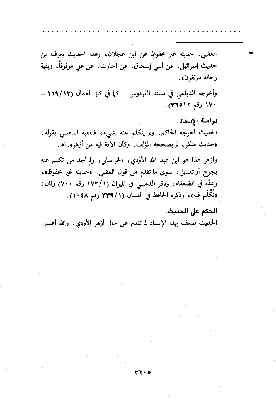 = العقيلي: حديثه غير محفوظ عن ابن عجلان، وهذا الحديث يعرف من حديث إسرائيل، عن أبي إسحاق، عن الحارث، عن علي موقوفاً، وبقية رجاله موثقون".