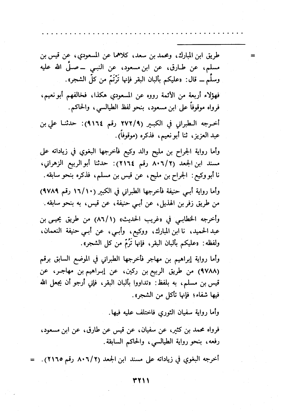 = طريق ابن المبارك، ومحمد بن سعد، كلاهما عن المسعودي، عن قيس بن مسلم، عن طارق، عن ابن مسعود، عن النبي -صلى الله عليه وسلم- قال: "عليكم بألبان البقر فإنها تَرْتَم من كل الشجر".