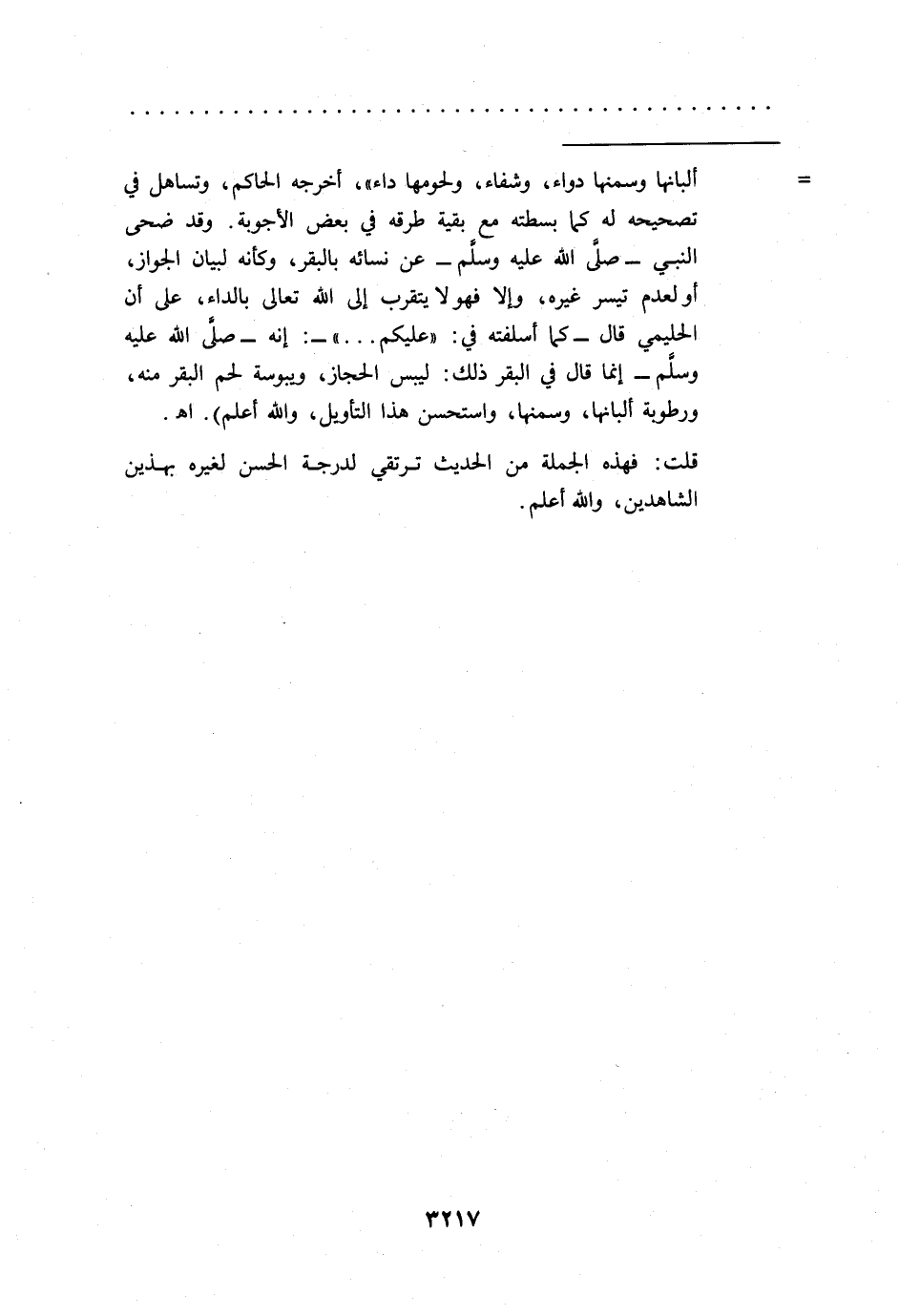 = ألبانها وسمنها دواء، وشفاء، ولحومها داء"، أخرجه الحاكم، وتساهل في تصحيحه له كما بسطته مع بقية طرقه في بعض الأجوبة. وقد ضحى النبي -صلى الله عليه وسلم- عن نسائه بالبقر، وكأنه لبيان الجواز، أو لعدم تيسر غيره، وإلا فهو لا يتقرب إلى الله تعالى بالداء، على أن الحليمي قال -كما أسلفته في: "عليكم ... "-: إنه -صلى الله عليه وسلم- إنما قال في البقر ذلك: ليبس الحجاز، ويبوسة لحم البقر منه، ورطوبة ألبانها، وسمنها، واستحسن هذا التأويل، والله أعلم). اهـ.