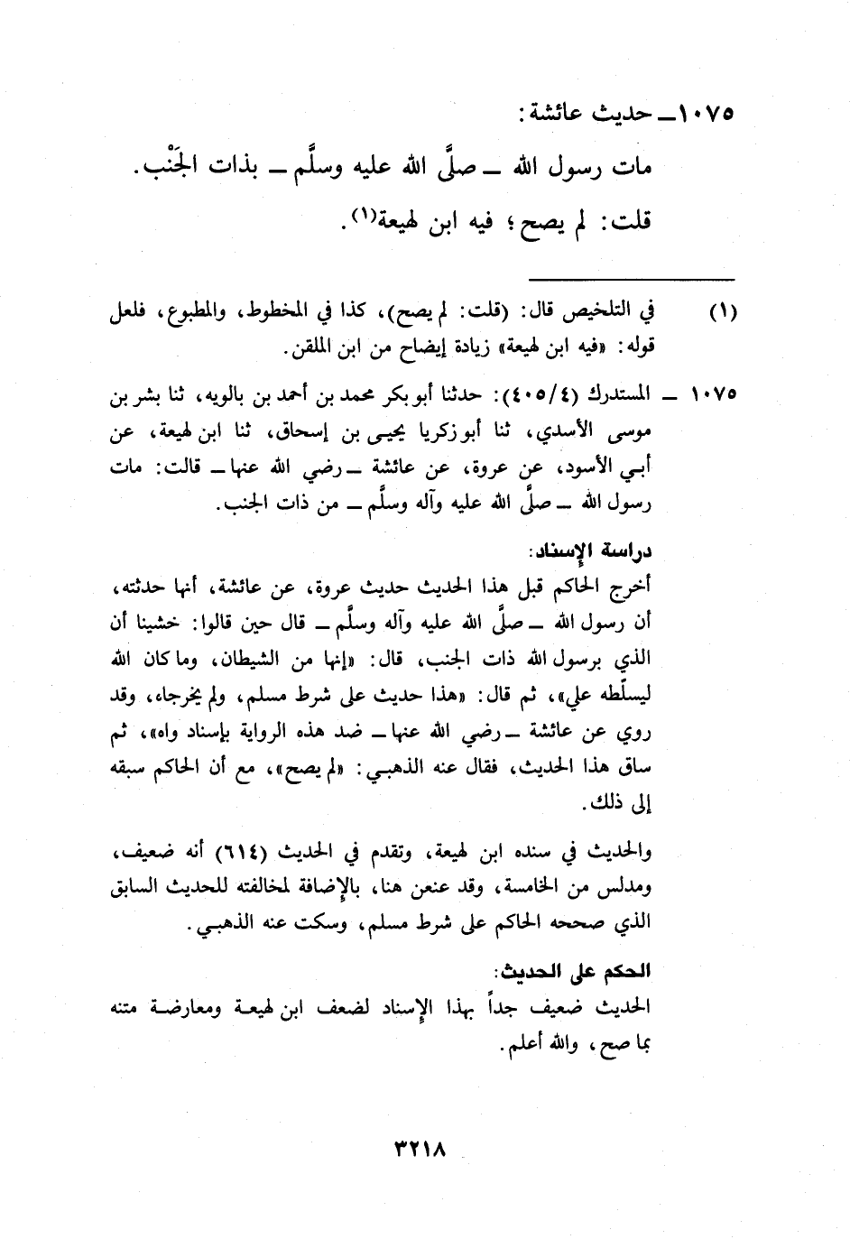 1075 - المستدرك (4/ 405): حدثنا أبو بكر محمد بن أحمد بن بالويه، ثنا بشر بن موسى الأسدي، ثنا أبو زكريا يحيى بن إسحاق، ثنا ابن لهيعة، عن أبي الأسود، عن عروة، عن عائشة -رضي الله عنها- قالت: مات رسول الله -صلى الله عليه وآله وسلم- من ذات الجنب.