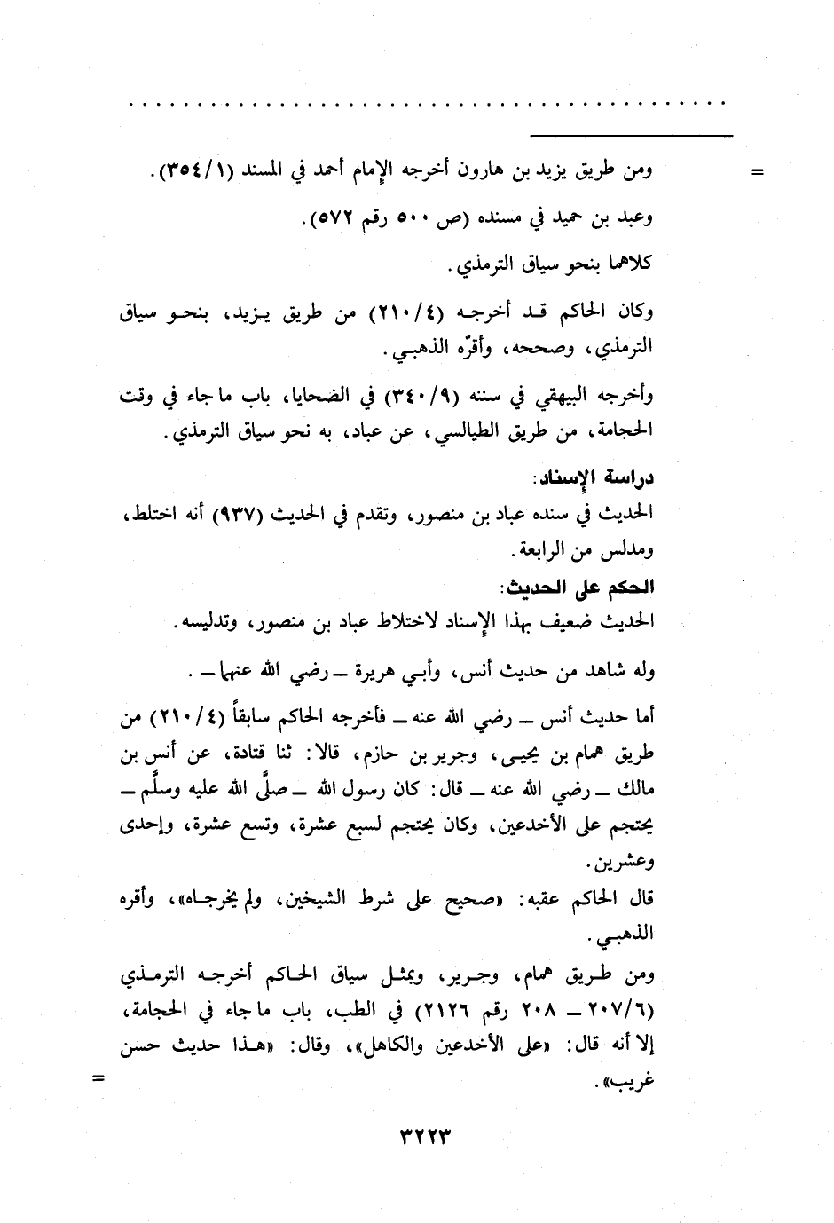 أما حديث أنس -رضي الله عنه- فأخرجه الحاكم سابقاً (4/ 210) من طريق همام بن يحيى، وجرير بن حازم، قالا: ثنا قتادة، عن أنس بن مالك -رضي الله عنه- قال: كان رسول الله -صلى الله عليه وسلم- يحتجم على الأخدعين، وكان يحتجم لسبع عشرة، وتسع عشرة، وإحدى وعشرين.