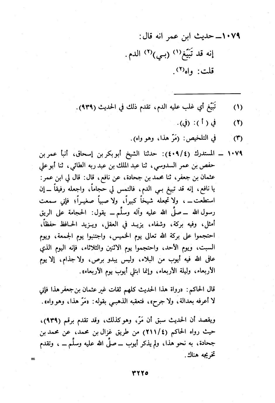 1079 - المستدرك (4/ 409): حدثنا الشيخ أبو بكر بن إسحاق، أنبأ عمر بن حفص بن عمر السدوسي، ثنا عبد الملك بن عبد ربه الطائي، ثنا أبو علي عثمان بن جعفر، ثنا محمد بن جحادة، عن نافع، قال: قال لي ابن عمر: يا نافع، إنه قد تبيغ بي الدم، فالتمس لي حجاماً، واجعله رفيقاً -إن استطعت-، ولا تجعله شيخاً كبيراً، ولا صبياً صغيراً؛ فإني سمعت رسول الله -صلى الله عليه وآله وسلم- يقول: الحجامة على الريق أمثل، وفيه بركة، وشفاء، يزيد في العقل، ويزيد الحافظ حفظاً، احتجموا على بركة الله تعالى يوم الخميس، واجتنبوا يوم الجمعة، ويوم السبت، ويوم الأحد، واحتجموا يوم الاثنين والثلاثاء، فإنه اليوم الذي عافى الله فيه أيوب من البلاء، وليس يبدو برص، ولا جذام، إلا يوم الأربعاء، وليلة الأربعاء، وإنما ابتلي أيوب يوم الأربعاء".