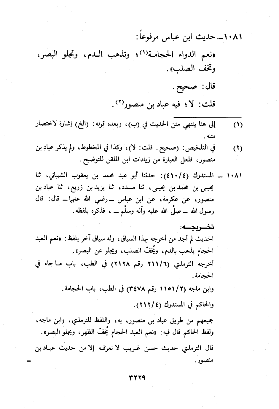 1081 - المستدرك (4/ 410): حدثنا أبو عبد محمد بن يعقوب الشيباني، ثنا يحيى بن محمد بن يحيى، ثنا مسدد، ثنا يزيد بن زريع، ثنا عباد بن منصور، عن عكرمة، عن ابن عباس -رضي الله عنهما- قال: قال رسول الله -صلى الله عليه وآله وسلم-، فذكره بلفظه.
