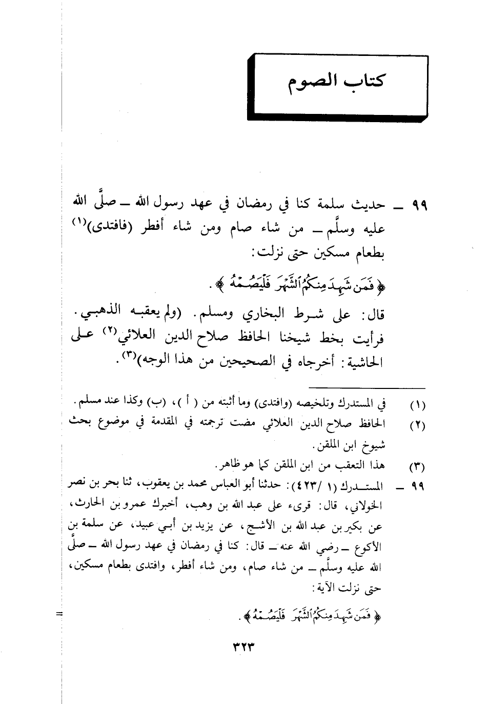 99 - المستدرك (1/ 423): حدثنا أبو العباس محمد بن يعقوب، ثنا بحر بن نصر الخولاني، قال: قريء على عبد الله بن وهب، أخبرك عمرو بن الحارث، عن بكير بن عبد الله بن الأشج، عن يزيد بن أبي عبيد، عن سلمة بن الأكوع -رضي الله عنه- قال: كنا في رمضان في عهد رسول الله -صلى الله عليه وسلم- من شاء صام، ومن شاء أفطر، وافتدى بطعام مسكين، حتى نزلت الآية: