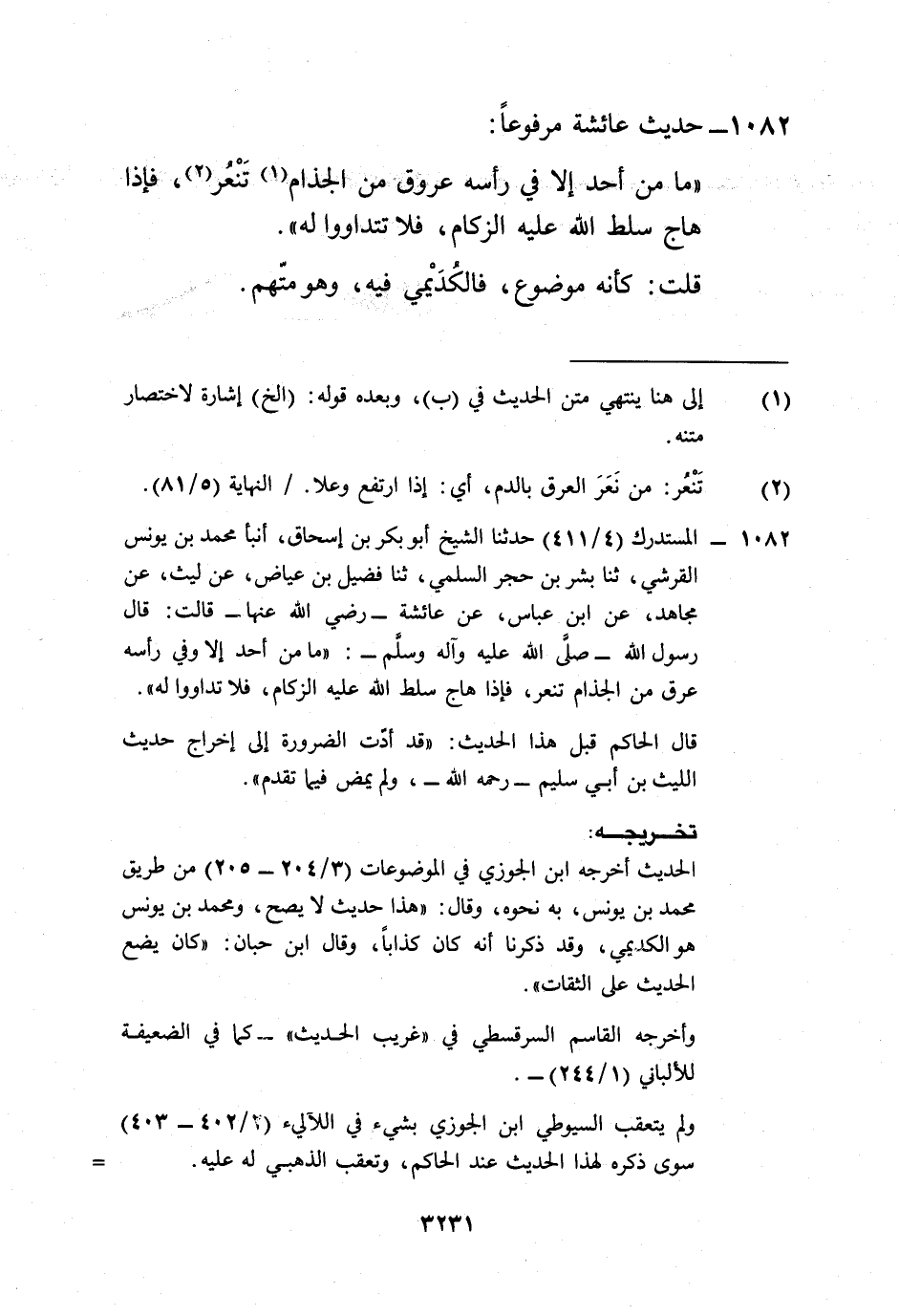 1082 - المستدرك (4/ 411) حدثنا الشيخ أبو بكر بن إسحاق، أنبأ محمد بن يونس القرشي، ثنا بشر بن حجر السلمي، ثنا فضيل بن عياض، عن ليث، عن مجاهد، عن ابن عباس، عن عائشة -رضي الله عنها- قالت: قال رسول الله- صلى الله عليه وآله وسلم-: "ما من أحد إلا وفي رأسه عرق من الجذام تنعر، فإذا هاج سلط الله عليه الزكام، فلا تداووا له".