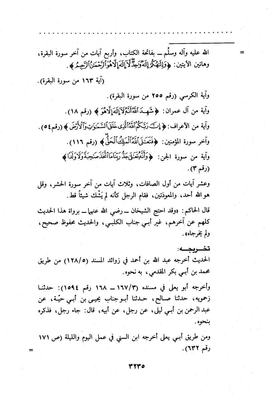 = الله عليه وآله وسلم- بفاتحة الكتاب، وأربع آيات من آخر سورة البقرة، وهاتين الآيتين: {وَإِلَهُكُمْ إِلَهٌ وَاحِدٌ لَا إِلَهَ إِلَّا هُوَ الرَّحْمَنُ الرَّحِيمُ (163)} [البقرة: 163].