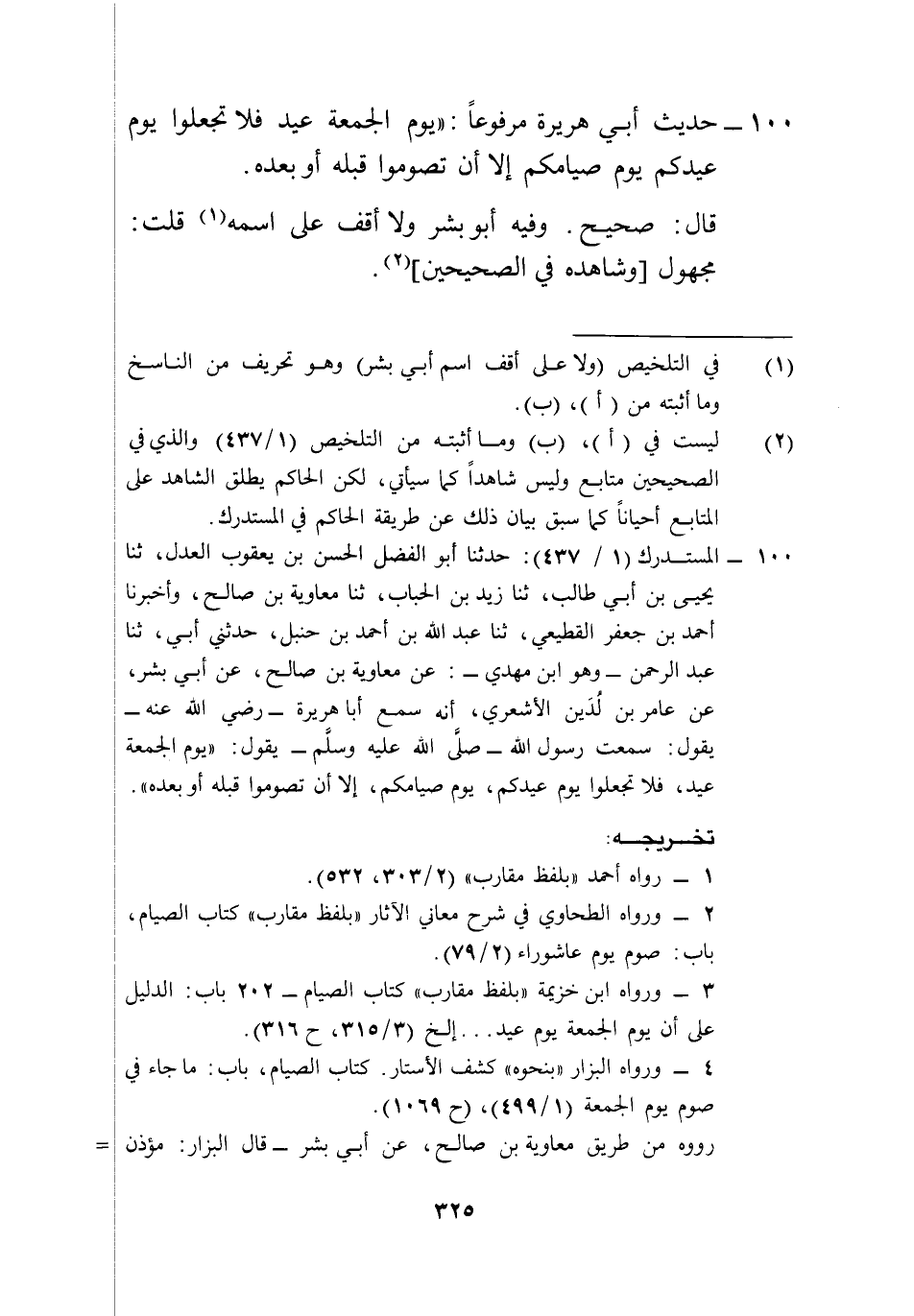100 - المستدرك (1/ 437): حدثنا أبو الفضل الحسن بن يعقوب العدل، ثنا يحيى بن أبي طالب، ثنا زيد بن الحباب، ثنا معاوية بن صالح، وأخبرنا أحمد بن جعفر القطيعي، ثنا عبد الله بن أحمد بن حنبل، حدثني أبي، ثنا عبد الرحمن -وهو ابن مهدي-: عن معاوية بن صالح، عن أبي بشر، عن عامر بن لُدَين الأشعري، أنه سمع أبا هريرة -رضي الله عنه- يقول: سمعت رسول الله -صلى الله عليه وسلم- يقول: "يوم الجمعة عيد، فلا تجعلوا يوم عيدكم، يوم صيامكم، إلا أن تصوموا قبله أو بعده".