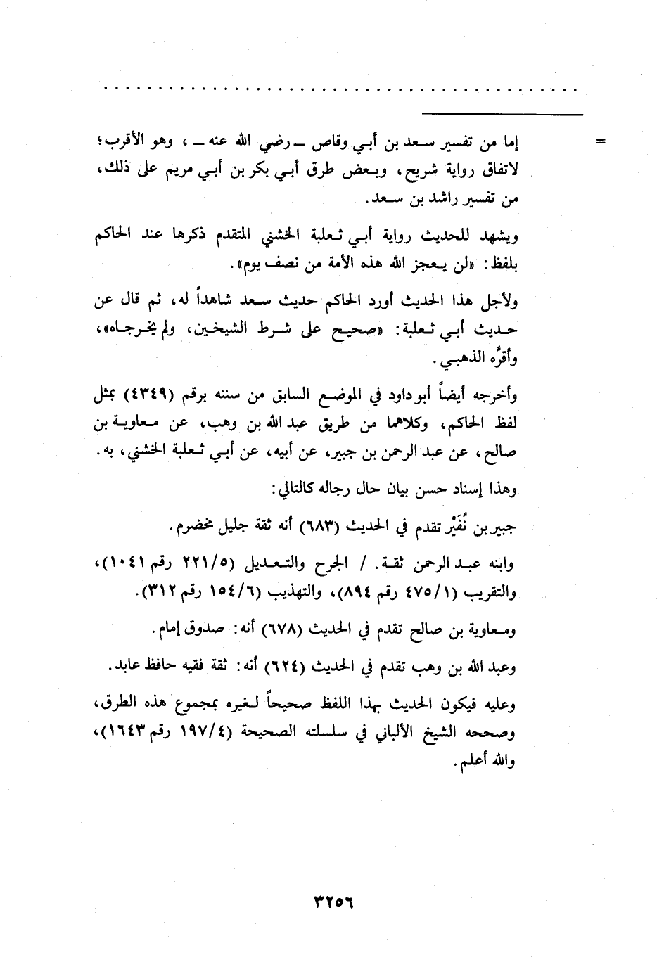 ولأجل هذا الحديث أورد الحاكم حديث سعد شاهداً له، ثم قال عن حديث أبي ثعلبة: "صحيح على شرط الشيخين، ولم يخرجاه"، وأقرة الذهبي.