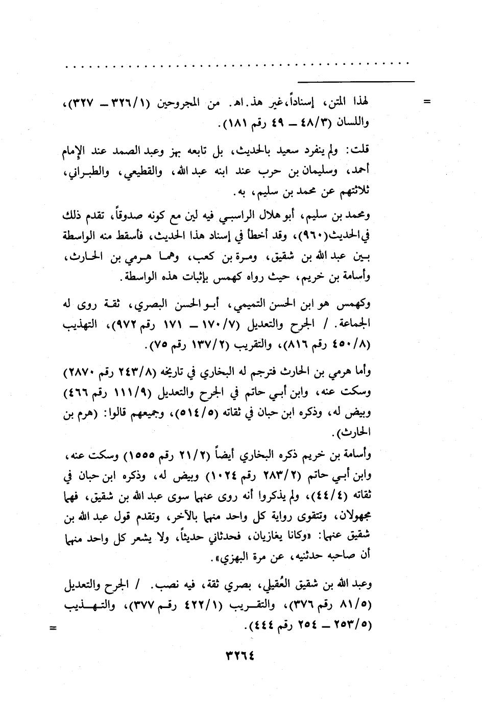 ومحمد بن سليم، أبو هلال الراسبي فيه لين مع كونه صدوقاً، تقدم ذلك في الحديث (960)، وقد أخطأ في إسناد هذا الحديث، فأسقط منه الواسطة بين عبد الله بن شقيق، ومرة بن كعب، وهما هرمي بن الحارث، وأسامة بن خريم، حيث رواه كهمس بإثبات هذه الواسطة.