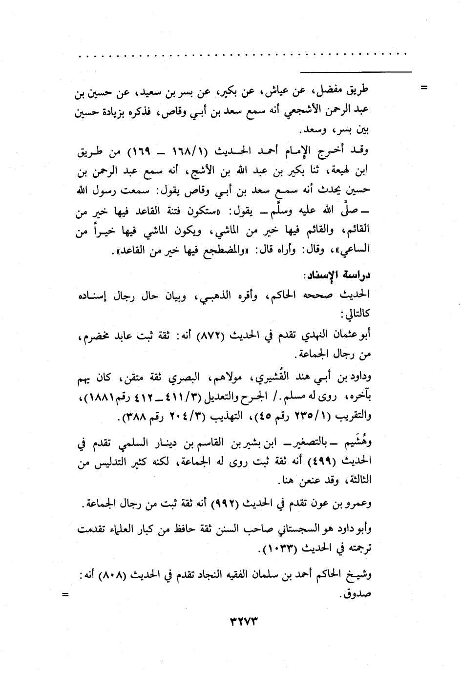 وقد أخرج الِإمام أحمد الحديث (1/ 168 - 169) من طريق ابن لهيعة، ثنا بكير بن عبد الله بن الأشج، أنه سمع عبد الرحمن بن حسين يحدث أنه سمع سعد بن أبي وقاص يقول: سمعت رسول الله -صلى الله عليه وسلم- يقول: "ستكون فتنة القاعد فيها خير من القائم، والقائم فيها خير من الماشي، ويكون الماشي فيها خيراً من الساعي"، وقال: وأراه قال: "والمضطجع فيها خير من القاعد".
