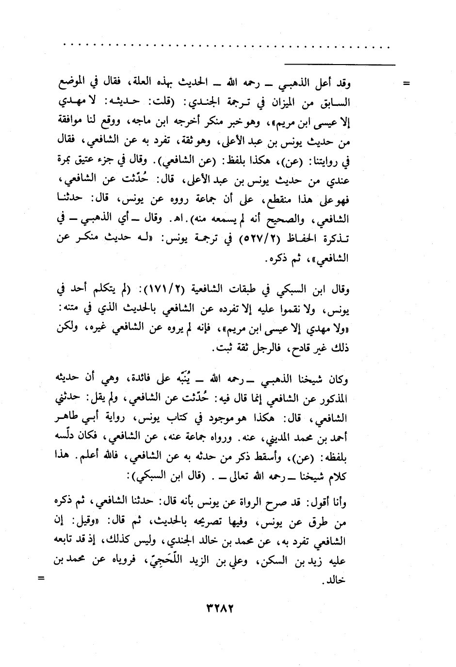 = وقد أعل الذهبي -رحمه الله- الحديث بهذه العلة، فقال في الموضع السابق من الميزان في ترجمة الجندي: (قلت: حديثه: لا مهدي إلا عيسى ابن مريم"، وهو خبر منكر أخرجه ابن ماجه، ووقع لنا موافقة من حديث يونس بن عبد الأعلى، وهو ثقة، تفرد به عن الشافعي، فقال في روايتنا: (عن)، هكذا بلفظ: (عن الشافعي). وقال في جزء عتيق بمرة عندي من حديث يونس بن عبد الأعلى، قال: حُدّثت عن الشافعي، فهو على هذا منقطع، على أن جماعة رووه عن يونس، قال: حدثنا الشافعي، والصحيح أنه لم يسمعه منه). اهـ. وقال -أي الذهبي- في تذكرة الحفاظ (2/ 527) في ترجمة يونس: "له حديث منكر عن الشافعي"، ثم ذكره.