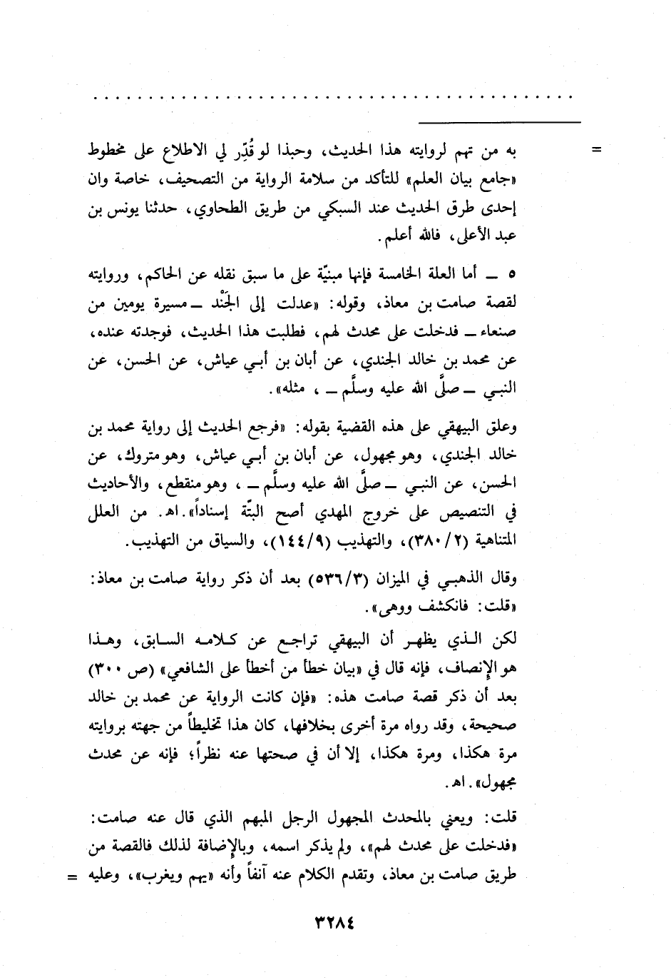 لكن الذي يظهر أن البيهقي تراجع عن كلامه السابق، وهذا هو الِإنصاف، فإنه قال في "بيان خطأ من أخطأ على الشافعي" (ص 300) بعد أن ذكر قصة صامت هذه: "فإن كانت الرواية عن محمد بن خالد صحيحة، وقد رواه مرة أخرى بخلافها، كان هذا تخليطاً من جهته بروايته مرة هكذا، ومرة هكذا، إلا أن في صحتها عنه نظراً؛ فإنه عن محدث مجهول".اهـ.