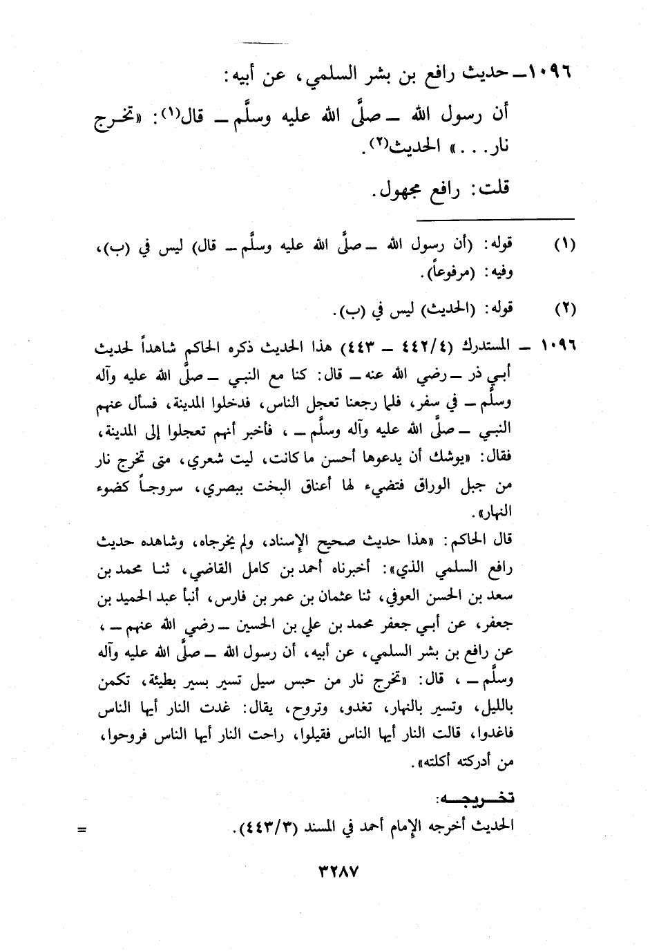 قال الحاكم: "هذا حديث صحيح الِإسناد، ولم يخرجاه، وشاهده حديث رافع السلمي الذي": أخبرناه أحمد بن كامل القاضي، ثنا محمد بن سعد بن الحسن العوفي، ثنا عثمان بن عمر بن فارس، أنبأ عبد الحميد بن جعفر، عن أبي جعفر محمد بن علي بن الحسين -رضي الله عنهم-، عن رافع بن بشر السلمي، عن أبيه، أن رسول الله -صلى الله عليه وآله وسلم-، قال: "تخرج نار من حبس سيل تسير بسير بطيئة، تكمن بالليل، وتسير بالنهار، تغدو، وتروح، يقال: غدت النار أيها الناس فاغدوا، قالت النار أيها الناس فقيلوا، راحت النار أيها الناس فروحوا، من أدركته أكلته".