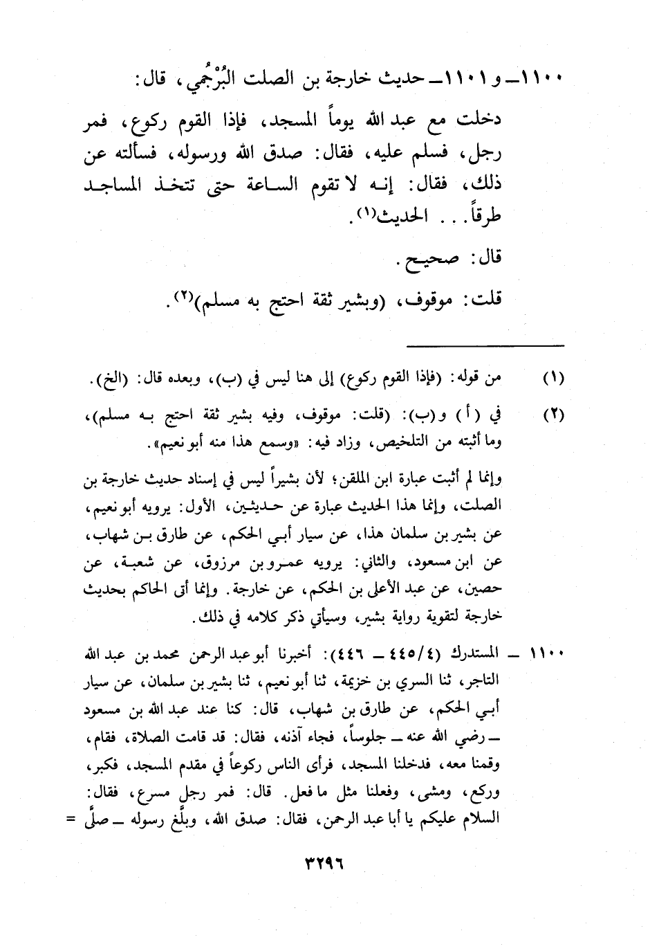 وإنما لم أثبت عبارة ابن الملقن؛ لأن بشيراً ليس في إسناد حديث خارجة بن الصلت، وإنما هذا الحديث عبارة عن حديثين، الأول: يرويه أبو نعيم، عن بشير بن سلمان هذا، عن سيار أبي الحكم، عن طارق بن شهاب، عن ابن مسعود، والثاني: يرويه عمرو بن مرزوق، عن شعبة، عن حصين، عن عبد الأعلى بن الحكم، عن خارجة. وإنما أتى الحاكم بحديث خارجة لتقوية رواية بشير، وسيأتي ذكر كلامه في ذلك.