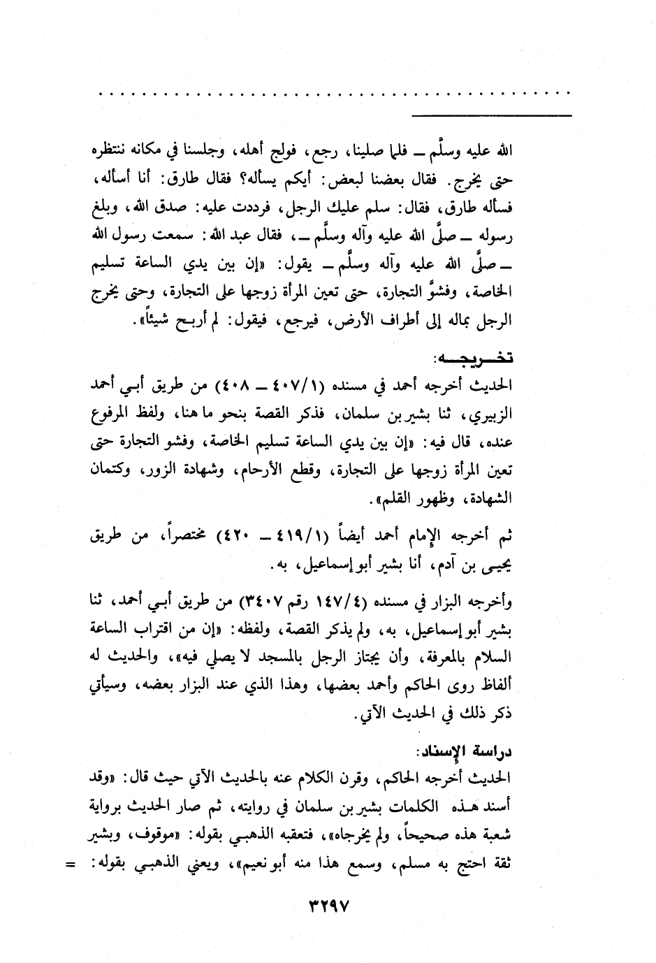 = الله عليه وسلم- فلما صلينا، رجع، فولج أهله، وجلسنا في مكانه ننتظره حتى يخرج. فقال بعضنا لبعض: أيكم يسأله؟ فقال طارق: أنا أسأله، فسأله طارق، فقال: سلم عليك الرجل، فرددت عليه: صدق الله، وبلغ رسوله -صلى الله عليه وآله وسلم-، فقال عبد الله: سمعت رسول الله -صلى الله عليه وآله وسلم- يقول: "إن بين يدي الساعة تسليم الخاصة، وفشوَّ التجارة، حتى تعين المرأة زوجها على التجارة، وحتى يخرج الرجل بماله إلى أطراف الأرض، فيرجع، فيقول: لم أربح شيئاً".