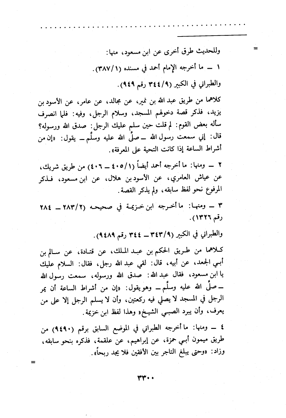 كلاهما من طريق الحكم بن عبد الملك، عن قتادة، عن سالم بن أبي الجعد، عن أبيه، قال: لقي عبد الله رجل، فقال: السلام عليك يا ابن مسعود، فقال عبد الله: صدق الله ورسوله، سمعت رسول الله -صلى الله عليه وسلم- وهو يقول: "إن من أشراط الساعة أن يمر الرجل في المسجد لا يصلي فيه ركعتين، وأن لا يسلم الرجل إلا على من يعرف، وأن يبرد الصبي الشيخ" وهذا لفظ ابن خزيمة.
