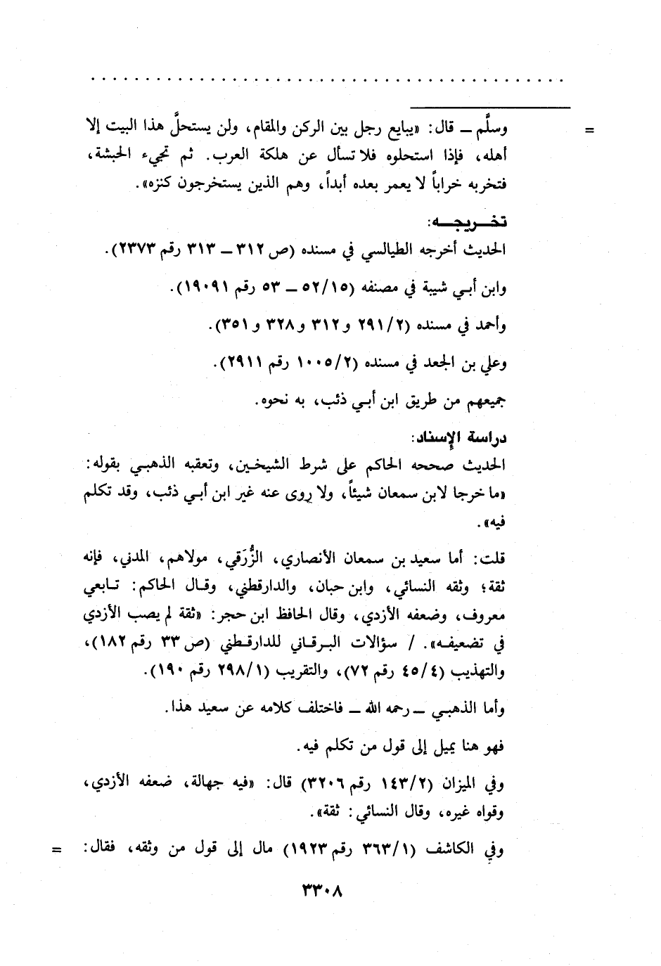 = وسلم- قال: "يبايع رجل بين الركن والمقام، ولن يستحلَّ هذا البيت إلا أهله، فإذا استحلوه فلا تسأل عن هلكة العرب. ثم تجيء الحبشة، فتخربه خراباً لا يعمر بعده أبداً، وهم الذين يستخرجون كنزه".
